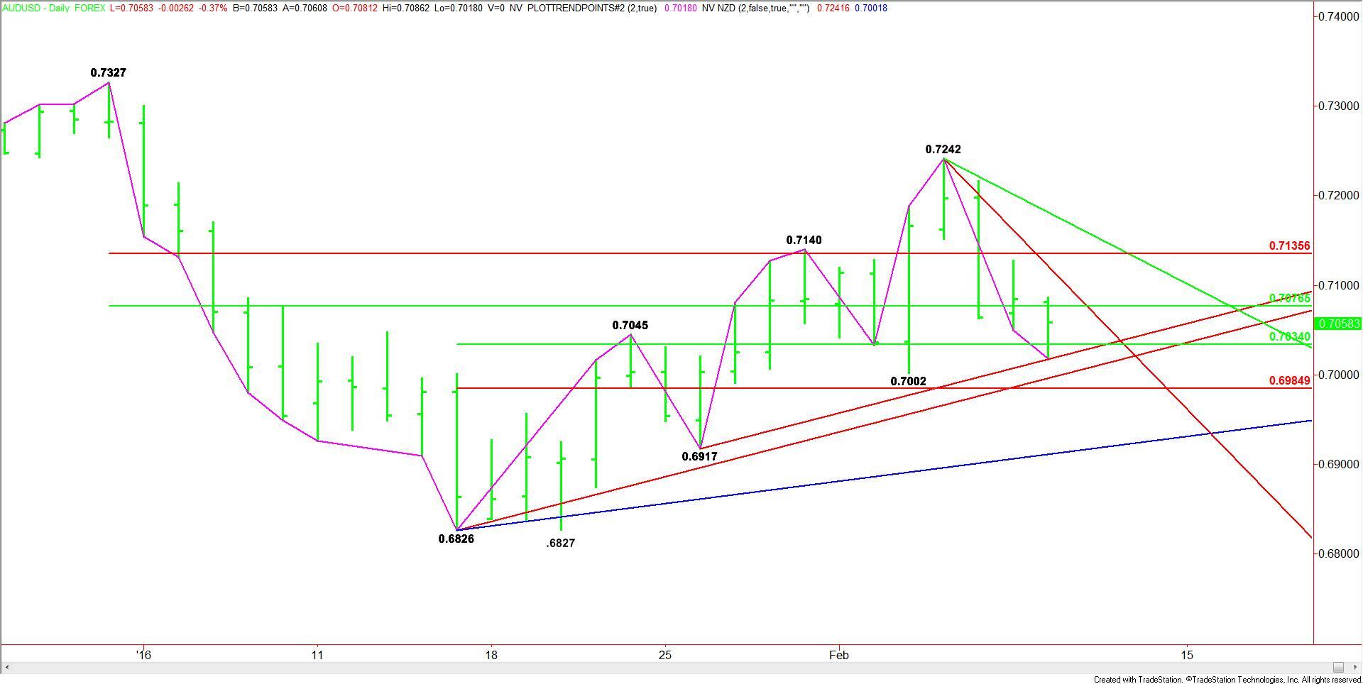 Technically, the main trend is up according to the daily swing chart. The trend will turn down on a trade through .7002.
