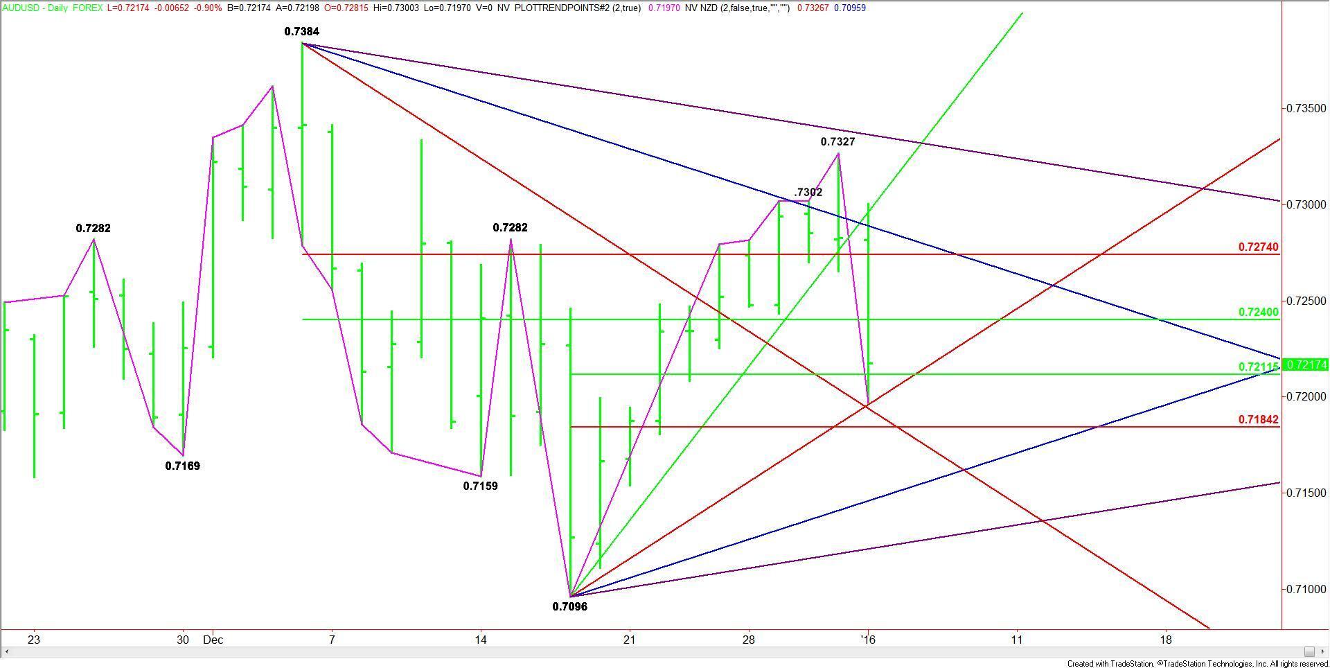 The main range is .7384 to .7096. After closing above its retracement zone at .7274 to .7240 on December 31, sellers came in today to drive the market to the bearish side of this zone, triggering the start of a steep sell-off.