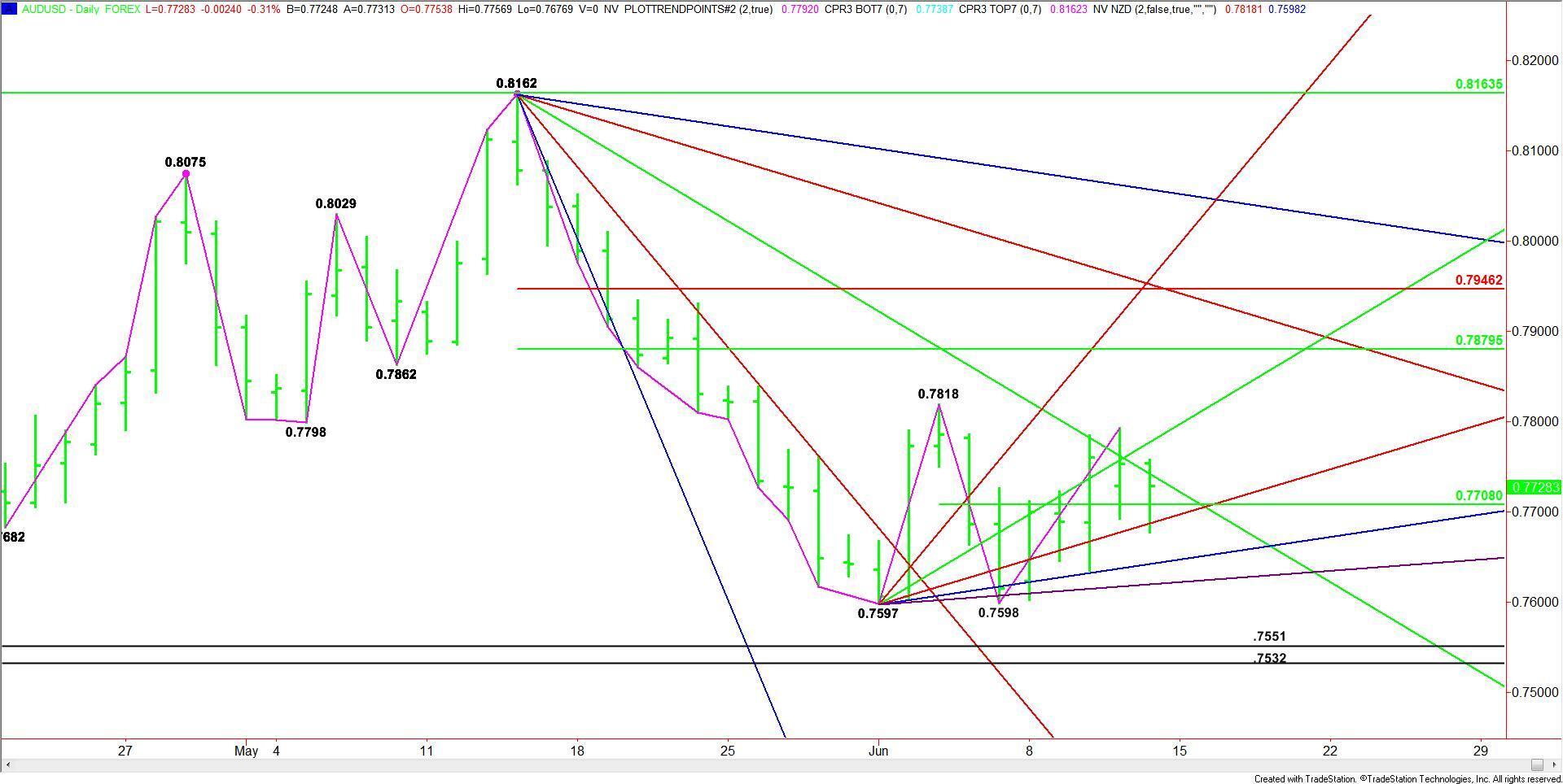 The AUD/USD posted an inside-range, higher-close on the weekly chart. The main trend is still up on the weekly chart despite the loss of upside momentum since the top at .8162 the week-ending May 15. The price action suggests a successful defense of the two lows at .7598 and .7532. Besides the two lows, additional support is a pair of uptrending angles at .7642 and .7587. A downtrending angle drops in at .7595.