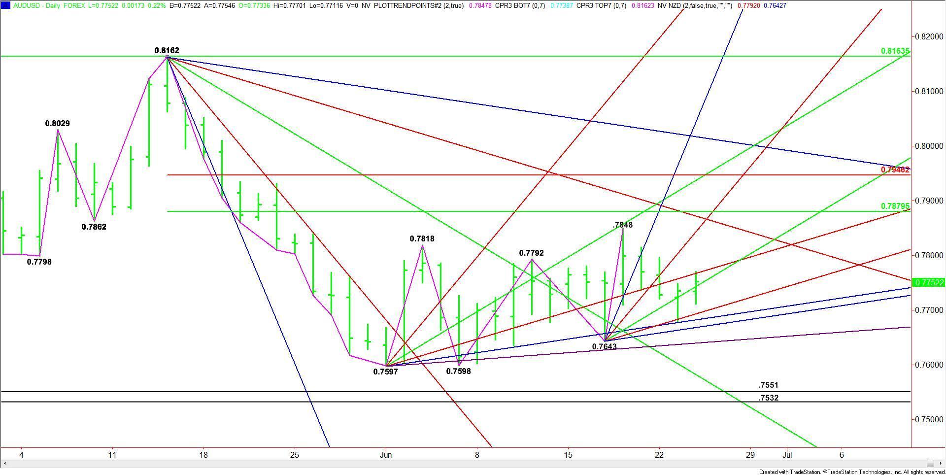 Technically, the main trend is up on the daily swing chart. Momentum, however, has been to the downside since June 18. The short-term range is .7643 to .7848. Its pivot at .7745 is controlling the short-term direction of the market. Yesterday’s close below this level is giving the market a downside bias.