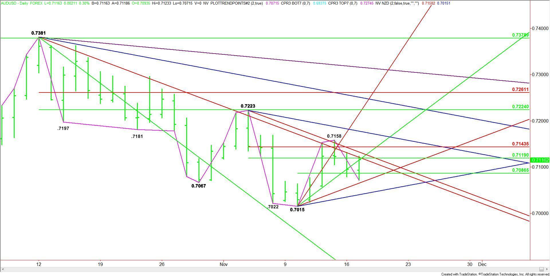Watch the price action and read the order flow at .7119 today. Trader reaction to this level will tell us whether the bulls or the bears are in control.