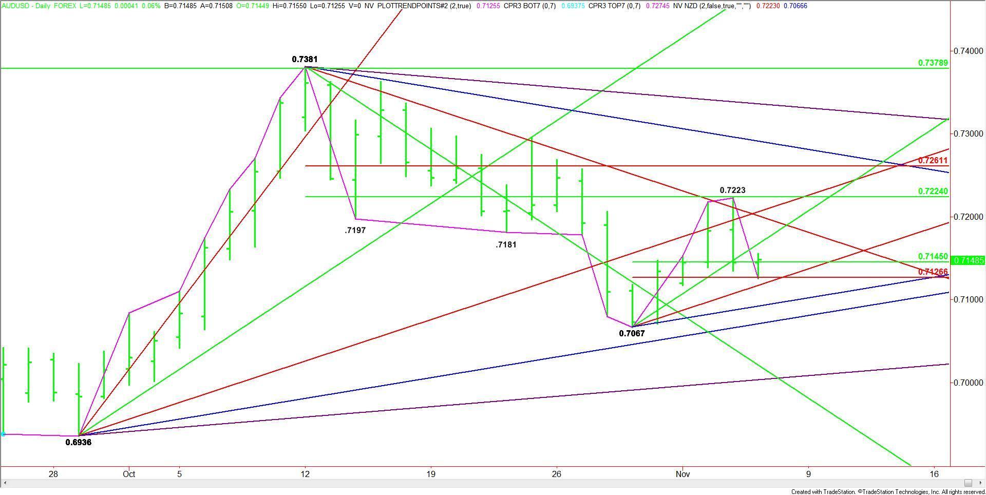 The new short-term range is .7067 to .7223. Its short-term retracement level at .7145 to .7127 is the primary downside target. This zone was tested earlier in the session and attracted enough buying interest to produce a technical bounce to the upside.