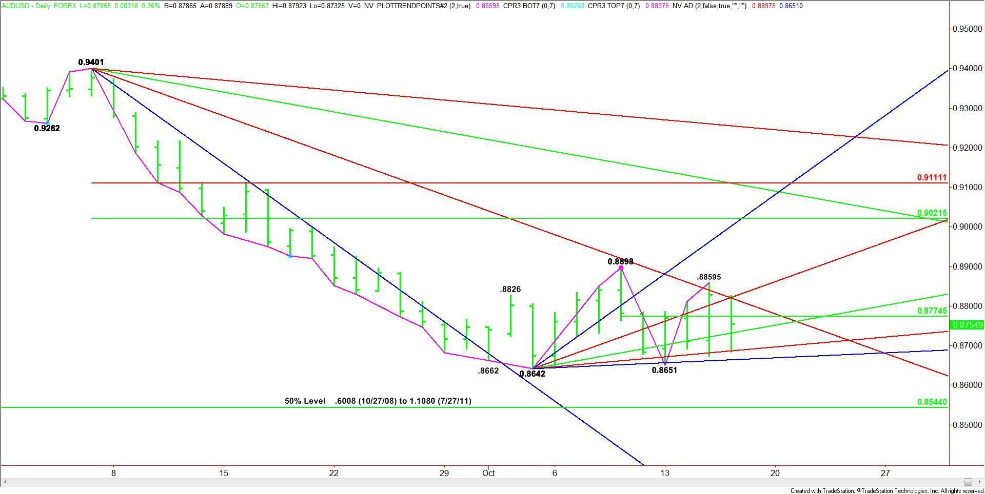 Holding the bottoms and the angles will indicate building strength, but don’t look for increased momentum until the long-term angle is taken out at .8801. This angle has stopped two rallies over the past six sessions so taking it out with conviction will be bullish.