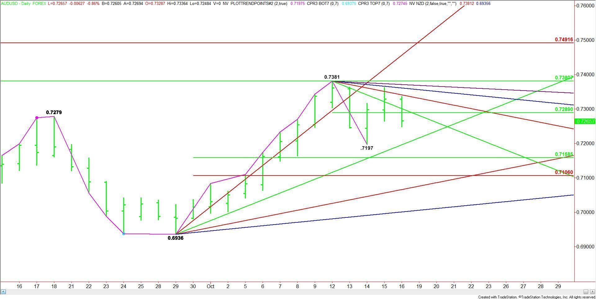 A sustained move over the short-term pivot at .7289 will signal the presence of buyers. Any rally is likely to be labored because of a series of downtrending angles at .7331, .7356 and .7369. The latter is the last potential resistance angle before the .7381 main top and major 50% level.