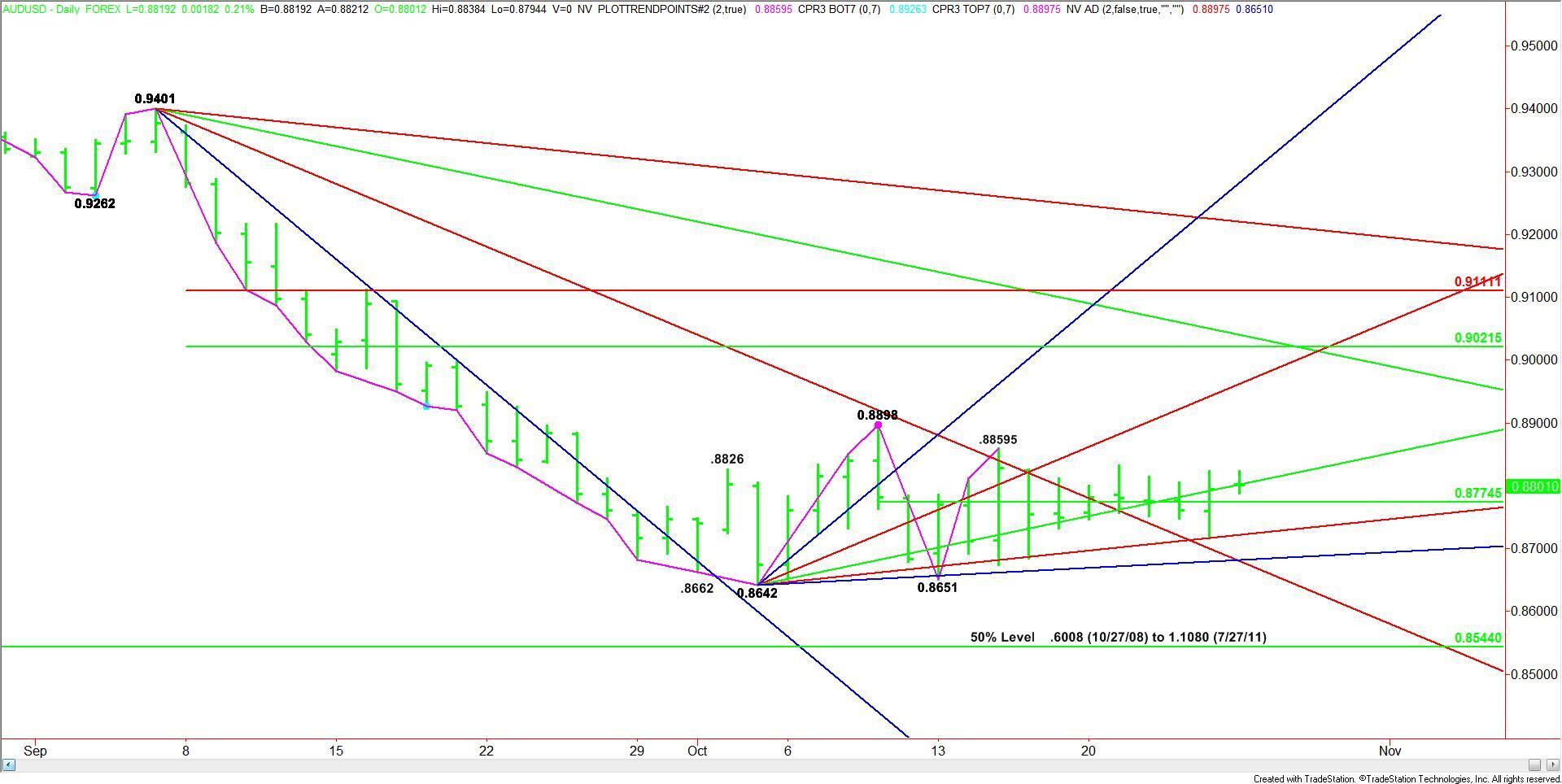 The AUD/USD finished slightly higher on Monday, but trading remained light and volume below average. The market is walking up an uptrending Gann angle from the .8642 bottom. This angle comes in today at .8812. The close at .8801 puts the Aussie on the bearish side of this angle on the opening, giving the market an early downside bias. Bullish traders will have to overtake .8812 in order to turn the sentiment back up.