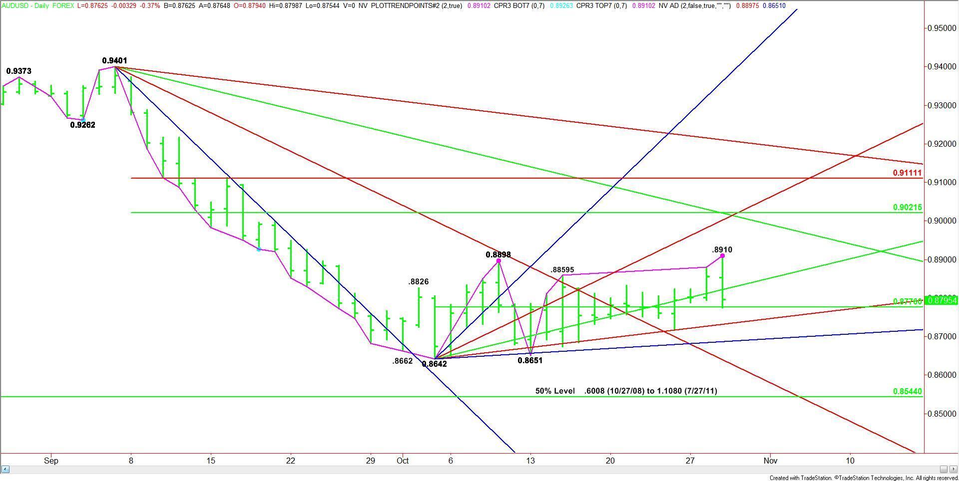 On the upside, overcoming .8832 may indicate short-covering while taking out .8910 will negate the bearish chart pattern and trigger a potential rally into .8898. The trend will change to up on a move through this level.