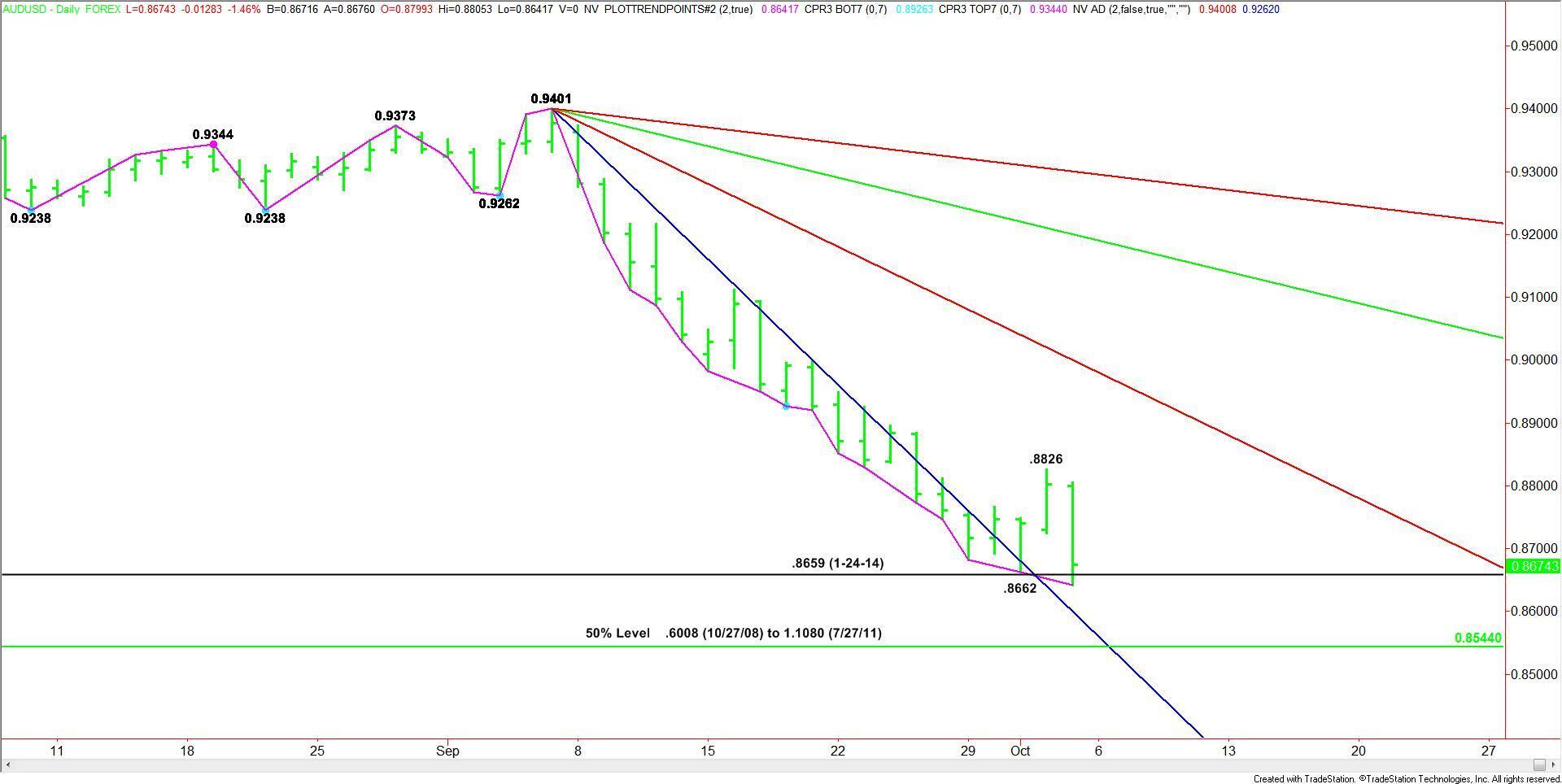 Holding .8659 will be a sign of short-covering. For some short-sellers, the low for the year at .8659 was their main downside objective. If a short-covering does begin then look for traders to go after the minor top at .8826. A breakout or sustained move over this price could trigger a further rally into the major downtrending angle at .8981.