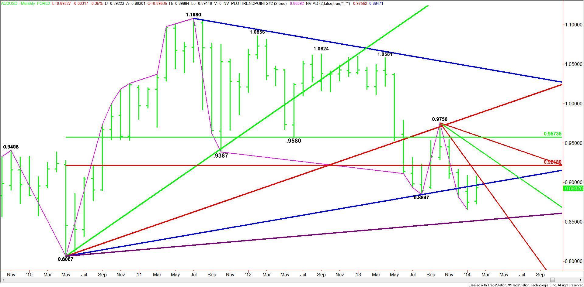 The Aussie opens the month on the weak side of an uptrending angle at .8987. Overtaking this angle could drive the market into a steep downtrending angle from the .9756 top at .8956. Since the main trend is down on the monthly chart, sellers are likely to come in on a test of this angle. The tone of the market this month will be determined by how investors react to .8987. Sustaining a move over this angle could be bullish for the Aussie.
