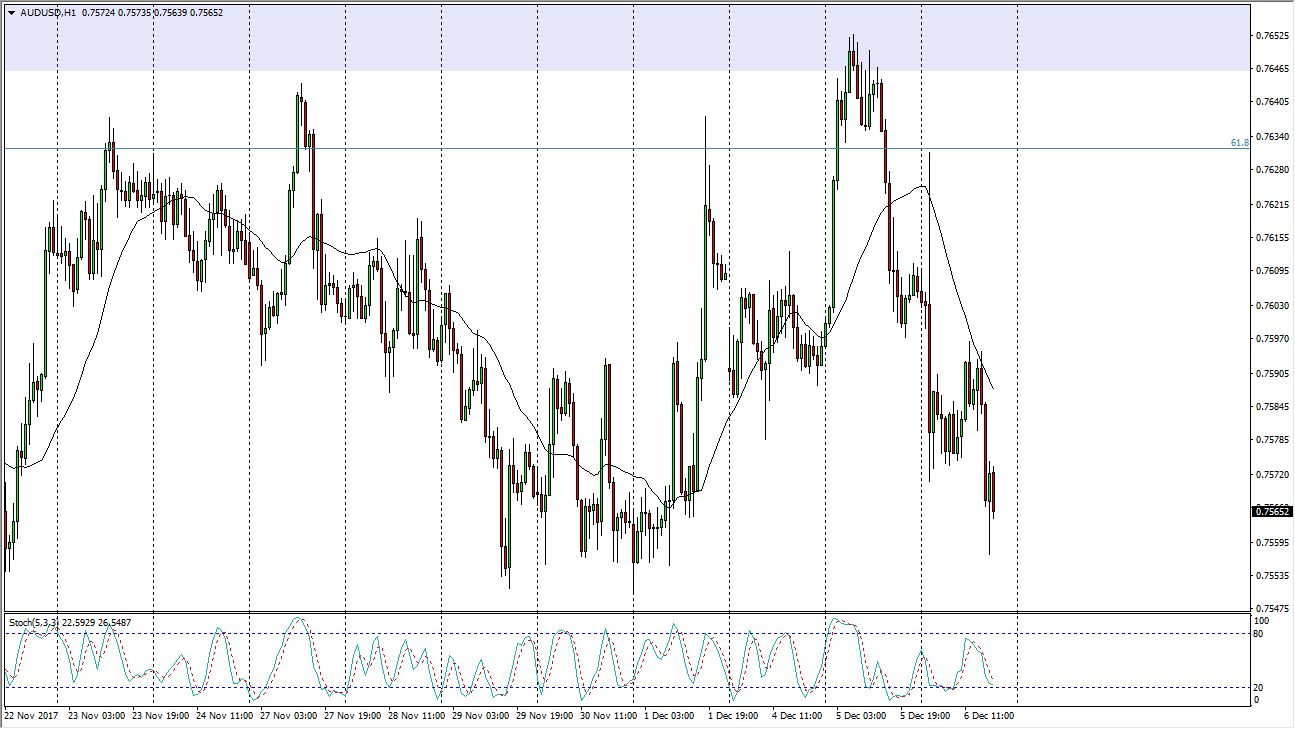The Australian dollar initially tried to rally during the trading session on Wednesday, reaching towards the 0.7625 level where we had seen quite a bit of resistance in the past. The sellers came back, and we exploded to the downside. The 0.7550 level is being tested for support, and I think that it is only a matter of time before a breakdown below there and challenge the 0.75 handle. That’s an area where there is a significant amount of support, so we can break down below there, the market could go much lower, perhaps reaching down to the 0.7350 level next. That’s not to say that it’s easy to do, but I do think that eventually we will break down, unless of course we get the usual boost from the gold markets, which don’t look particularly lively currently.