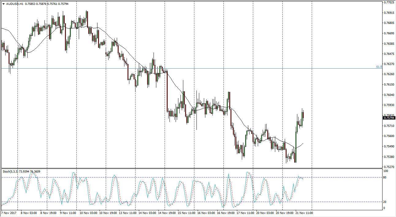 The Australian dollar rallied significantly during the trading session on Tuesday, using the RBA announcement as a bit of a catalyst. However, there are several other reasons that the market is going to continue to struggle. The 0.76 level above looks to be offering resistance, and now that we have rallied to that area, the hourly chart is showing signs of exhaustion on the stochastic oscillator. If we get a roll over from here, essentially a move below the 0.7560 handle, I think we will go back down towards the 0.75 level, and make another attempt to break down below there. Once we do close below that level, the market goes down to the 0.7350 level. Alternately, a move above the 0.76 level should send this market towards the 0.77 handle after that.
