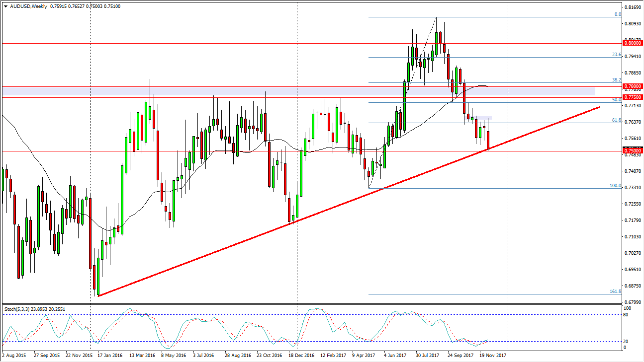 In general, I don’t have any interest in buying this market, least not until we would do a break above the weekly candle that we have just printed, as it would show a significant bounce from an area that quite frankly needs to hold. Gold would also have to rally, and perhaps even break above the $1300 level to add any momentum to this market, as the 2 are so interconnected. I just don’t see this happening, so I remain very bearish in general, expecting the Australian dollar to continue the move that we have seen over the last several weeks.