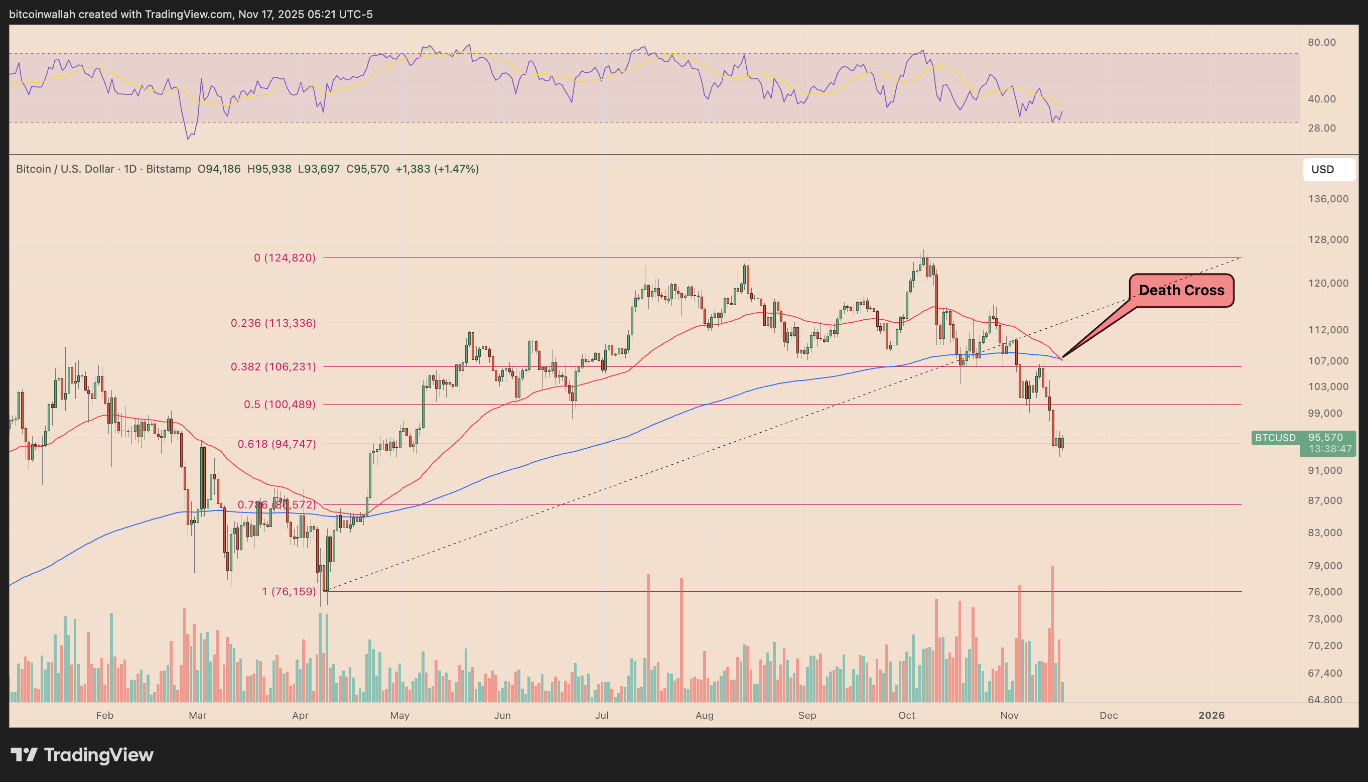 Conversely, failing to hold above the $94,750 mark risks increasing the decline risk toward the $0.236 Fib line, near $86,000, in November.