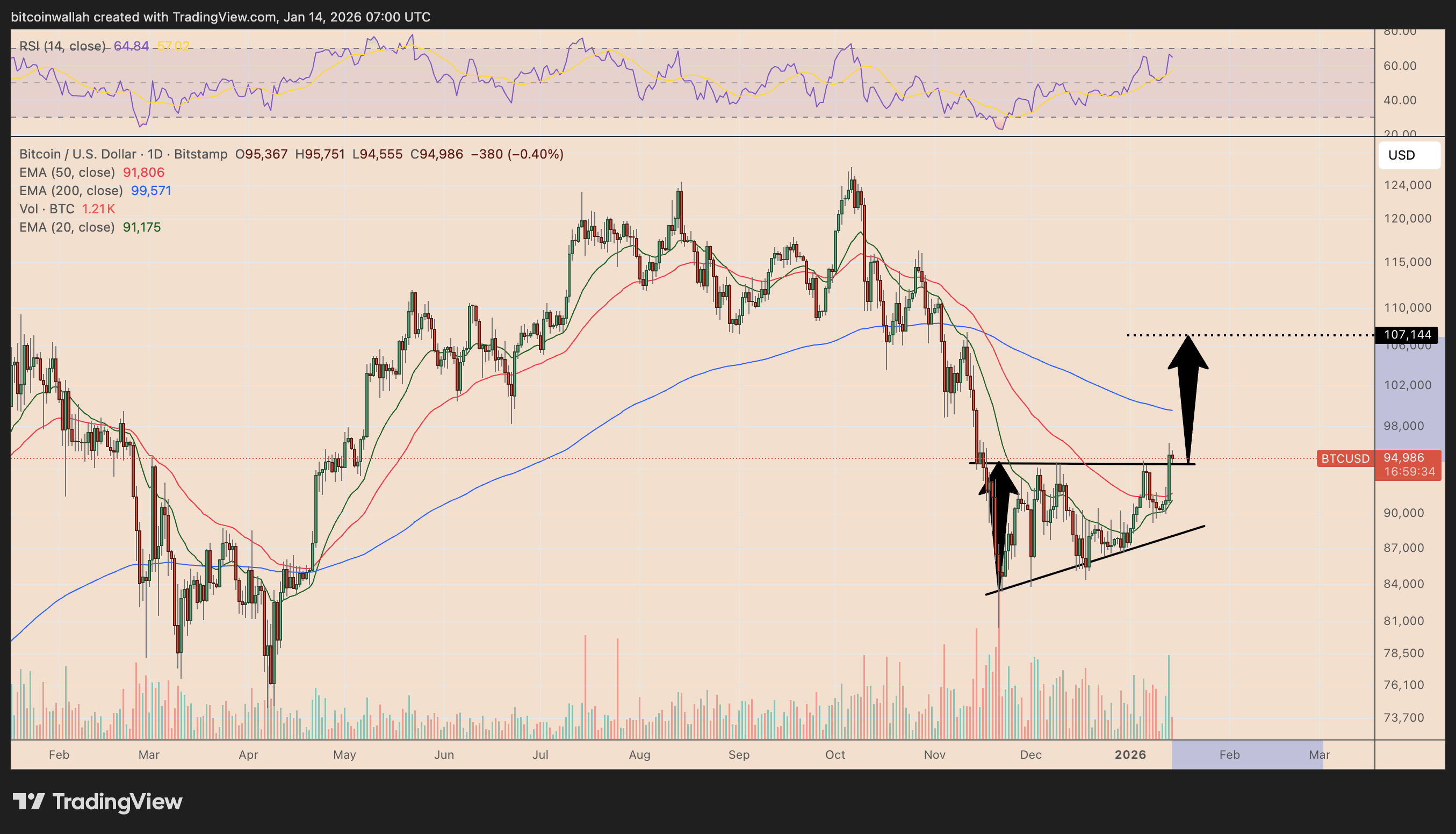 Conversely, failure to hold above the former triangle resistance could invalidate the bullish setup, exposing BTC to renewed consolidation toward the $92,000–$90,000 region.