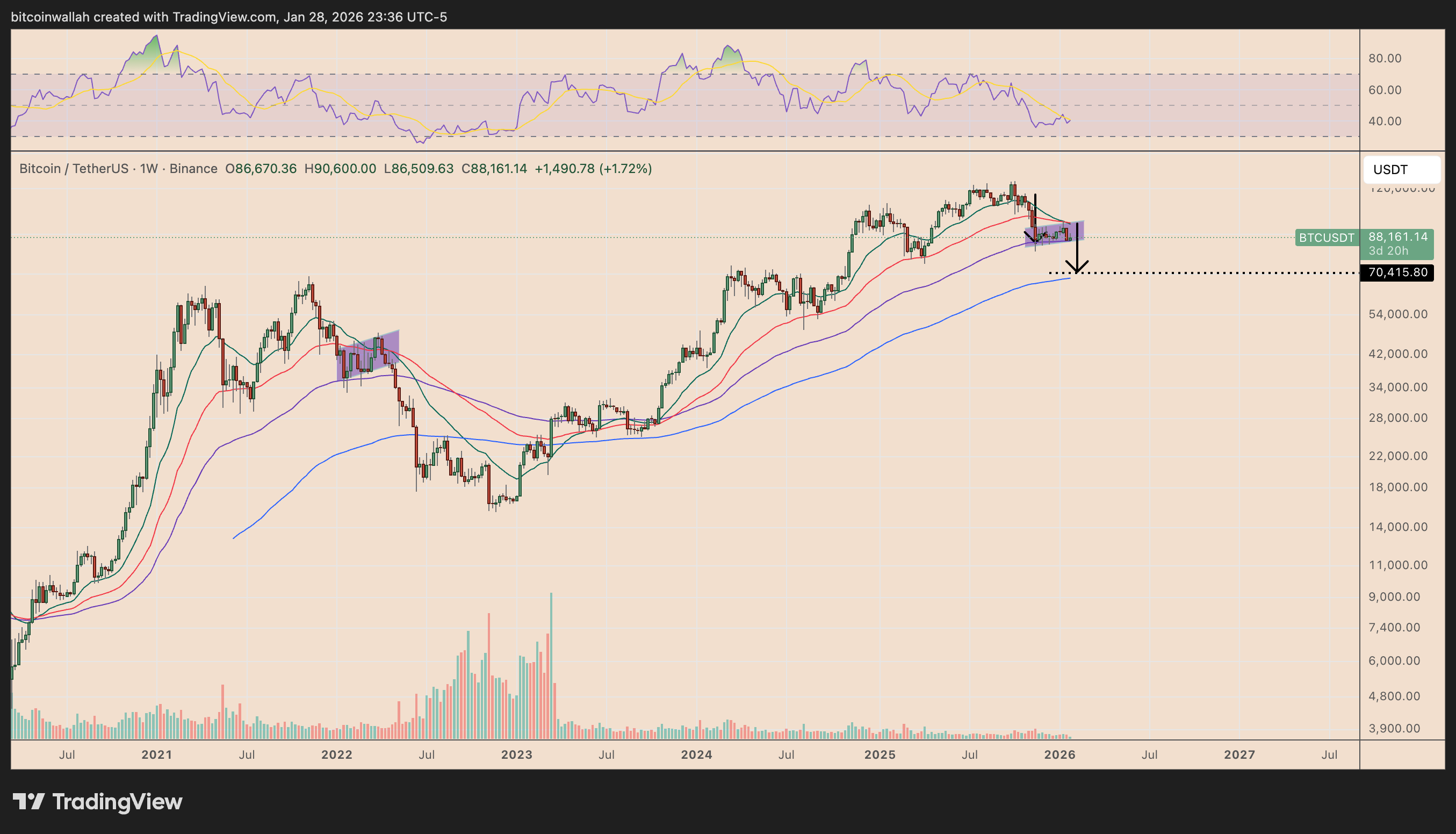 If BTC loses the flag support on a weekly close, the move could trigger a continuation drop, with the next major downside area near $70,000. The level aligns with the 200-week EMA (the blue wave).