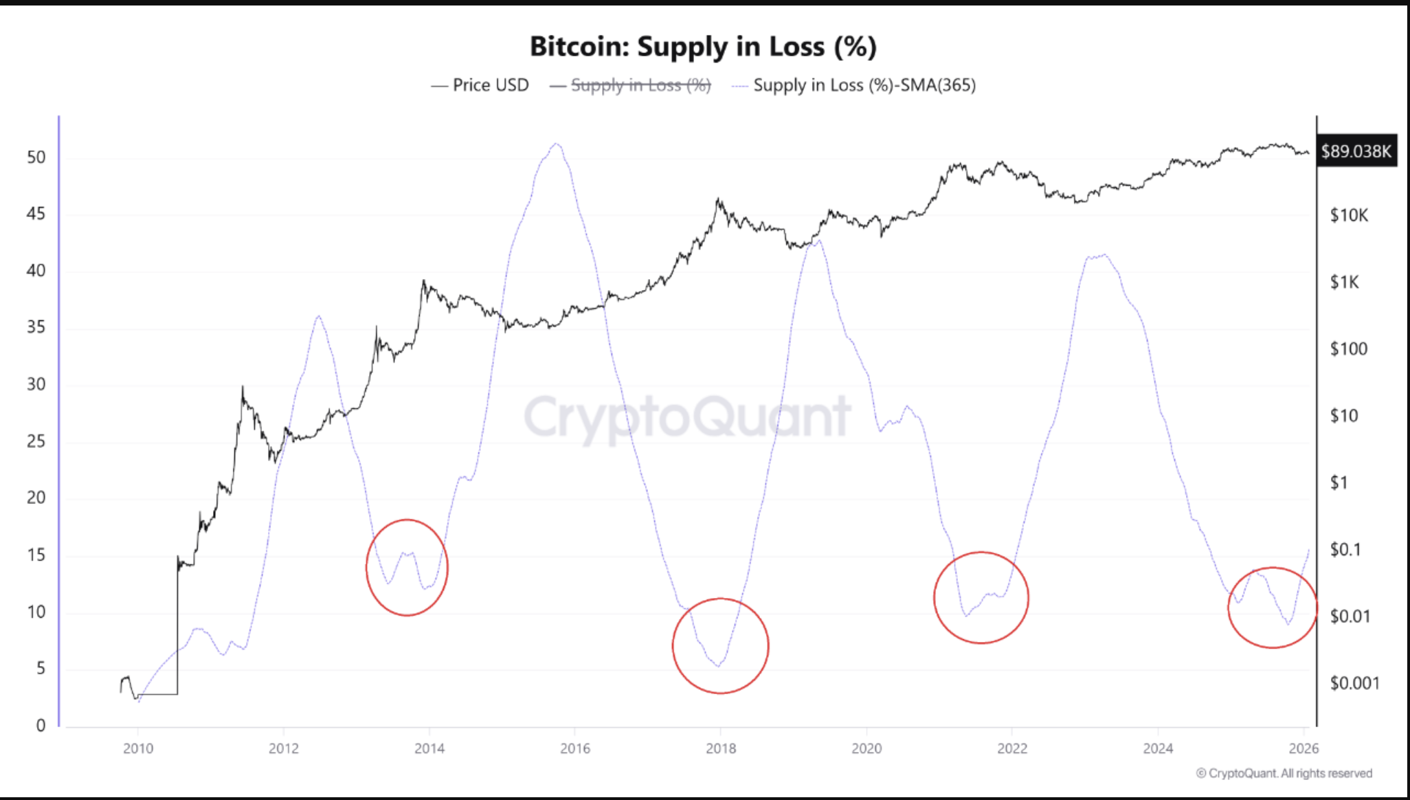 Bitcoin’s Supply in Loss is rising after years in decline, an early warning that downside pressure is spreading beyond short-term traders.