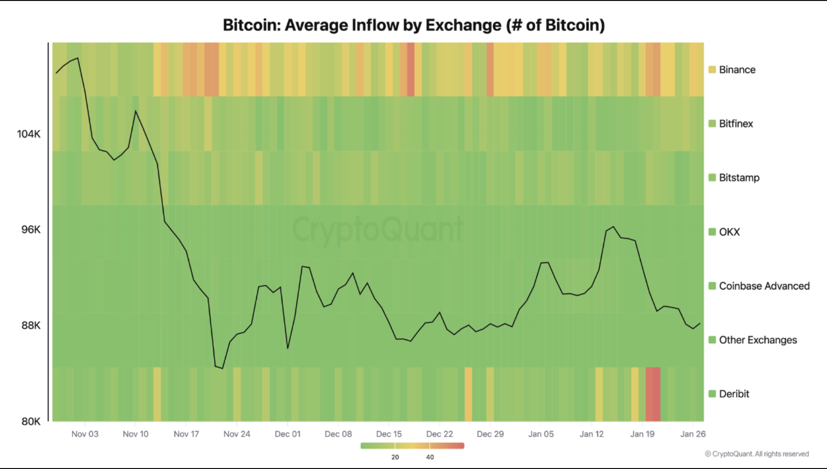 Average Bitcoin deposits to exchanges rose from 0.7 to 1.2 BTC as its price climbed from $80,000 to $98,000 between November 2025 and January 2026.