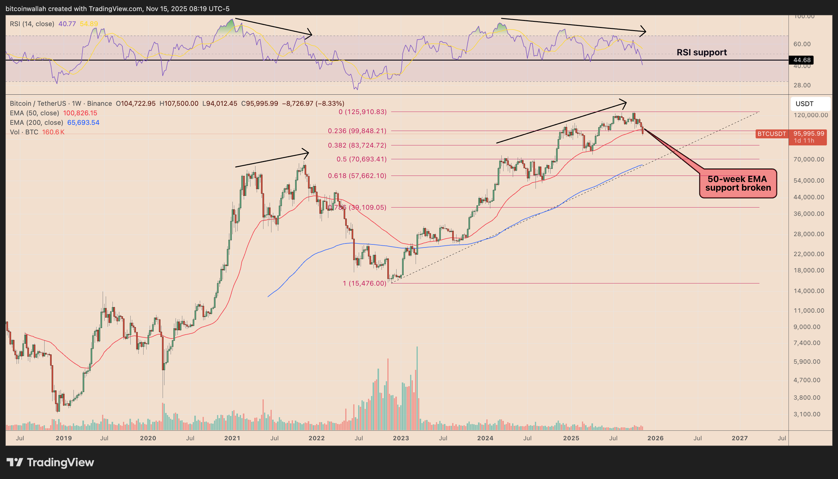 Bitcoin is also confronting a key structural test on its weekly time frame after closing below the 50-week EMA for the first time since early 2023.