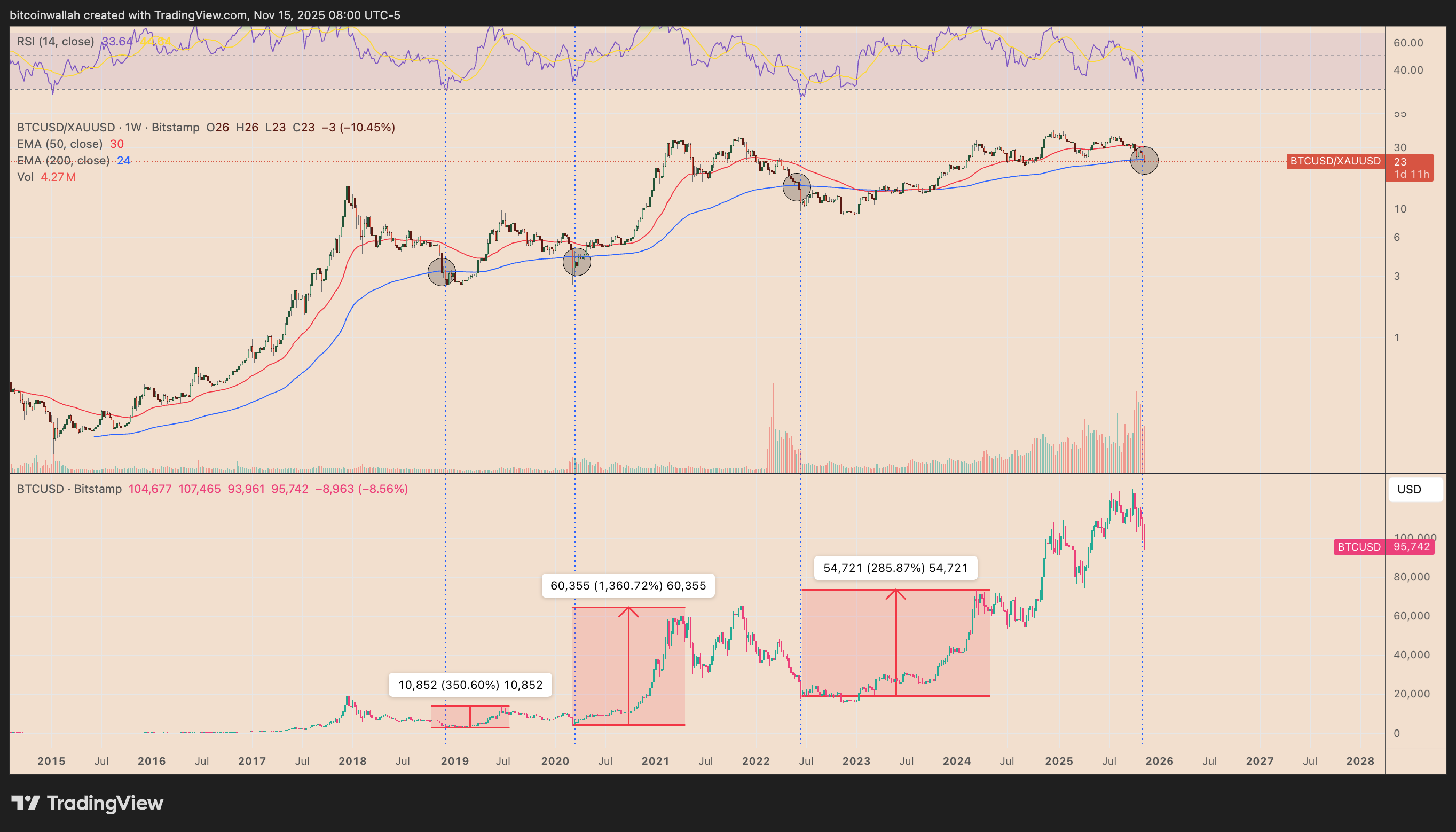 On Nov. 15, the Bitcoin-to-gold ratio (BTC/XAU) fell 10.45% on the week and slipped 4.8% below its 200-week exponential moving average (EMA), a trendline breach that has preceded every major BTC/USD cycle bottom for the past decade.