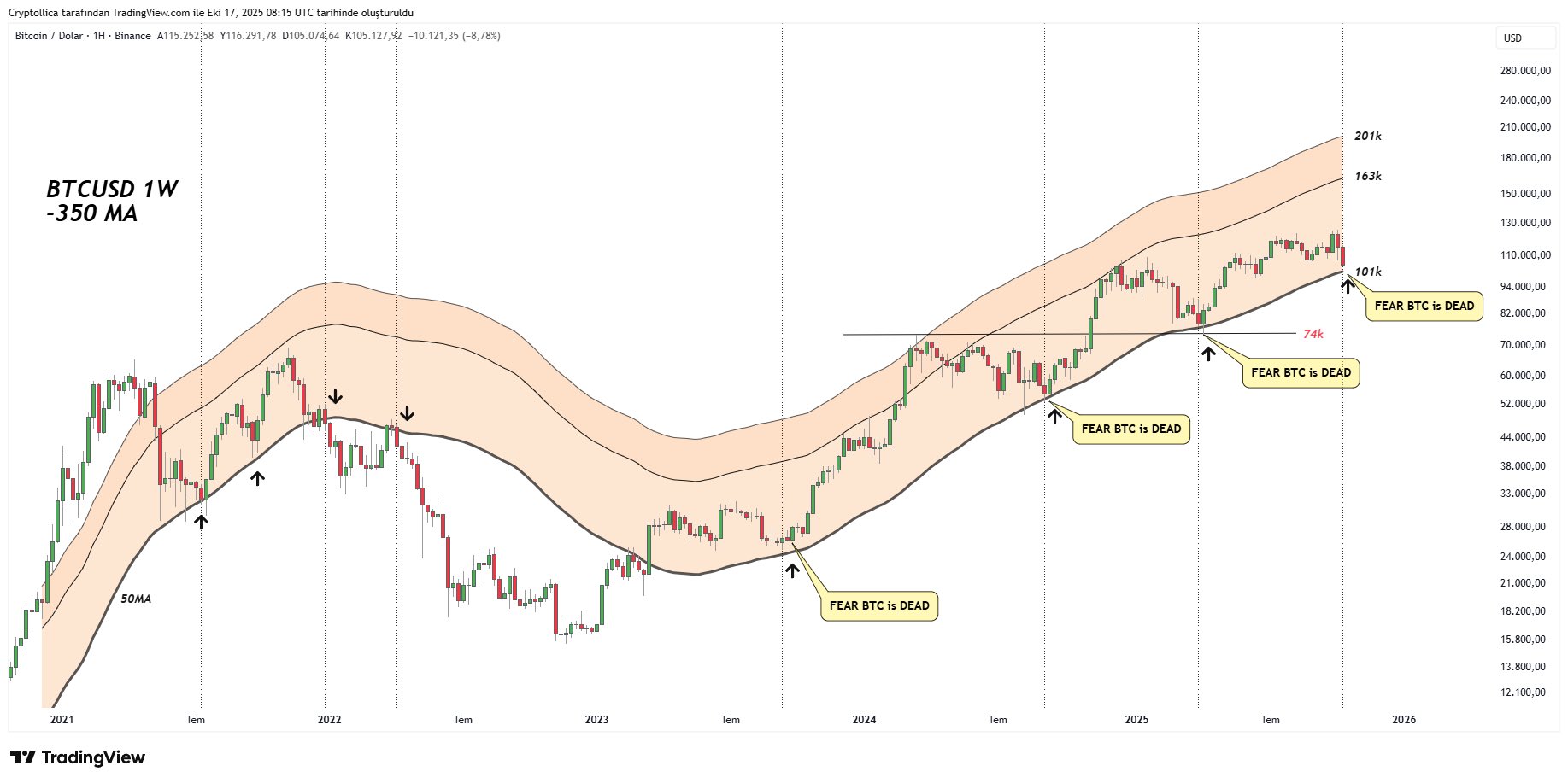 Bitcoin could aim for the upper end of its long-term channel if the pattern repeats, roughly between $163,000 and $201,000.