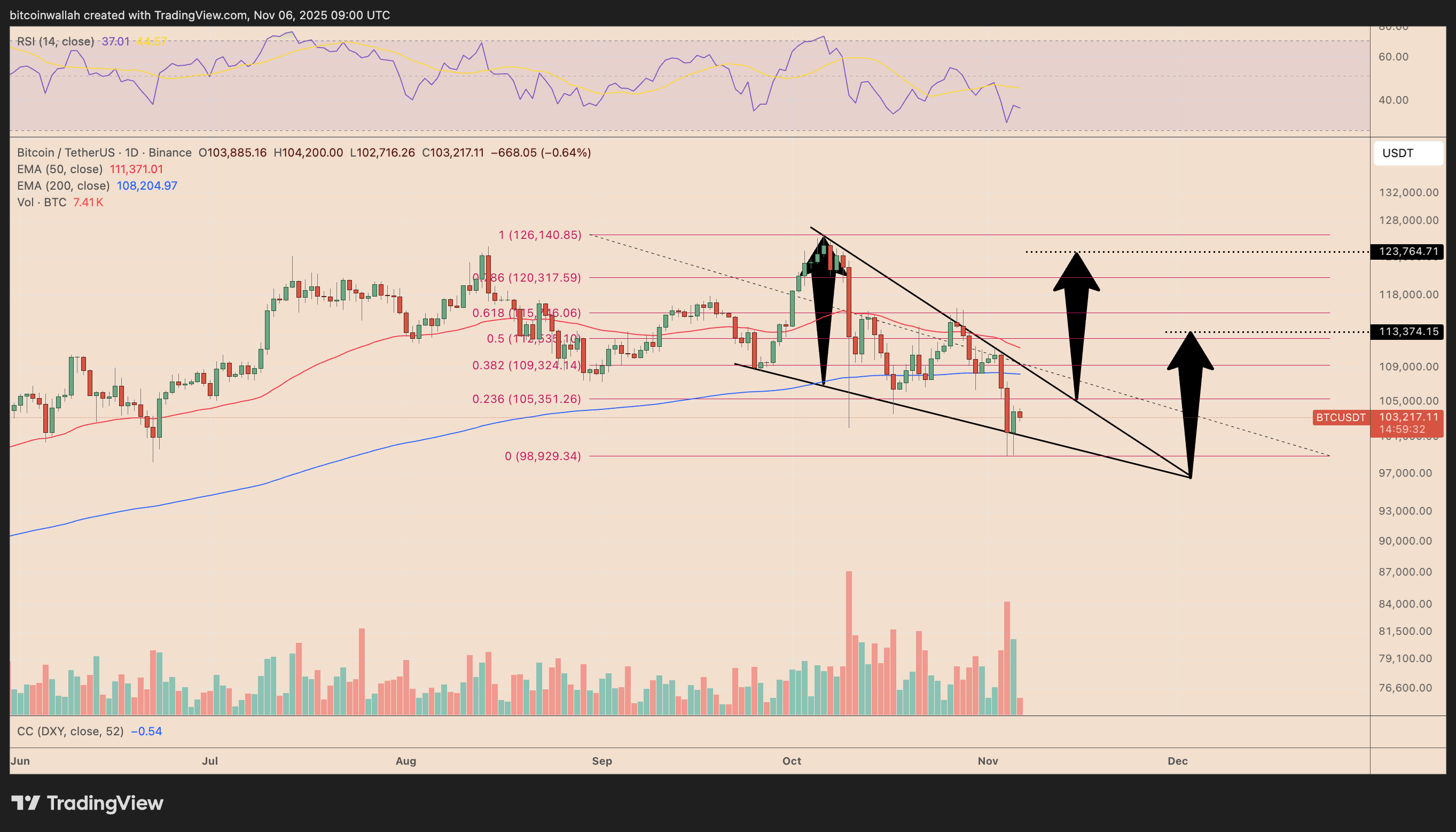 If confirmed, a breakout above the wedge’s resistance could trigger a 20% rally, initially targeting the $113,000 level (the 0.382 Fibonacci retracement) and, in a more extended move, the $123,700 region near the 0.786 Fib line.