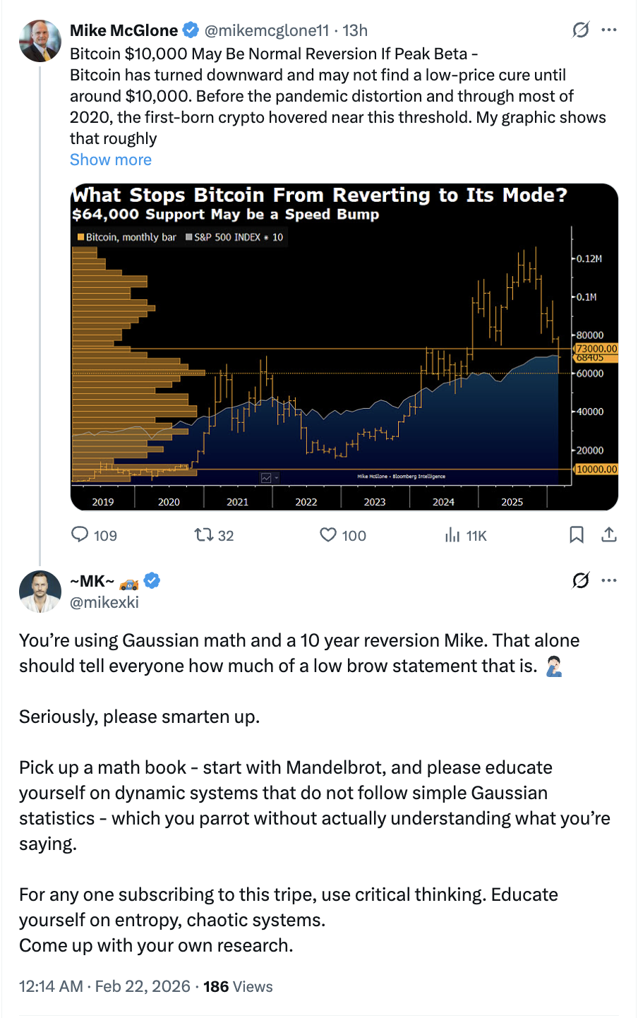 In short, his thesis says Bitcoin’s post-2020 rally depends on excess liquidity. If that excess fades, price gravitates back toward its pre-stimulus equilibrium near $10,000.