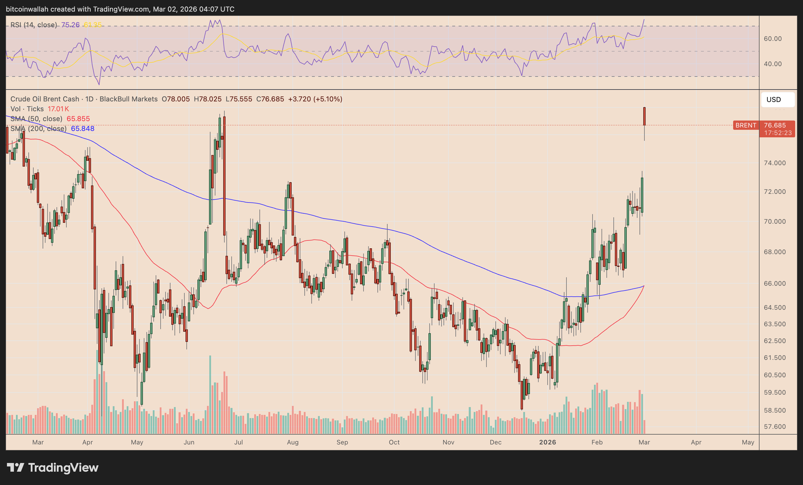 Bitcoin’s rebound is also unfolding inside what looks like a bear pennant on the daily chart, forming after the sharp drop from the $73,000–$74,000 area into the $63,000 low.