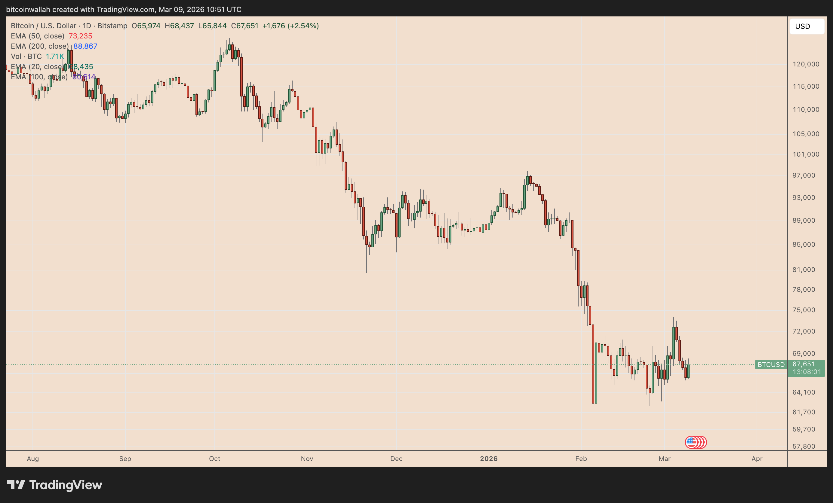 For now, BTC is attempting to bounce toward the upper trendline at around $73,250, aligning with the 50-day exponential moving average (50-day EMA; the red wave).