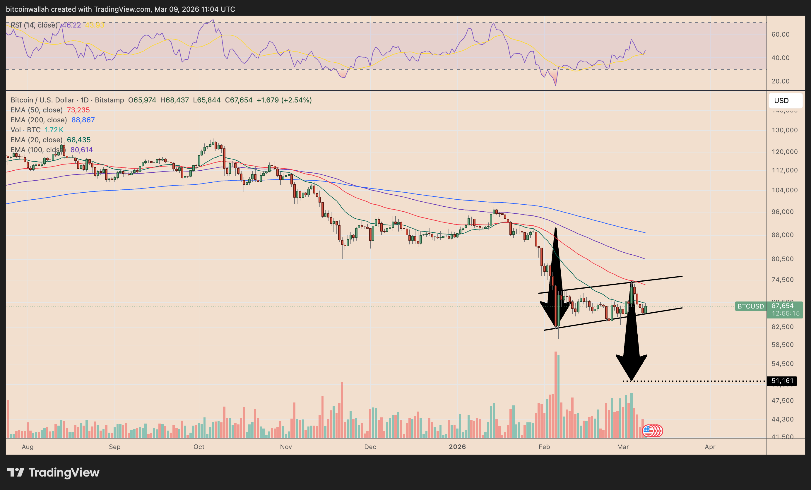 Bitcoin’s ongoing consolidation has painted what appears to be a bear flag structure.
