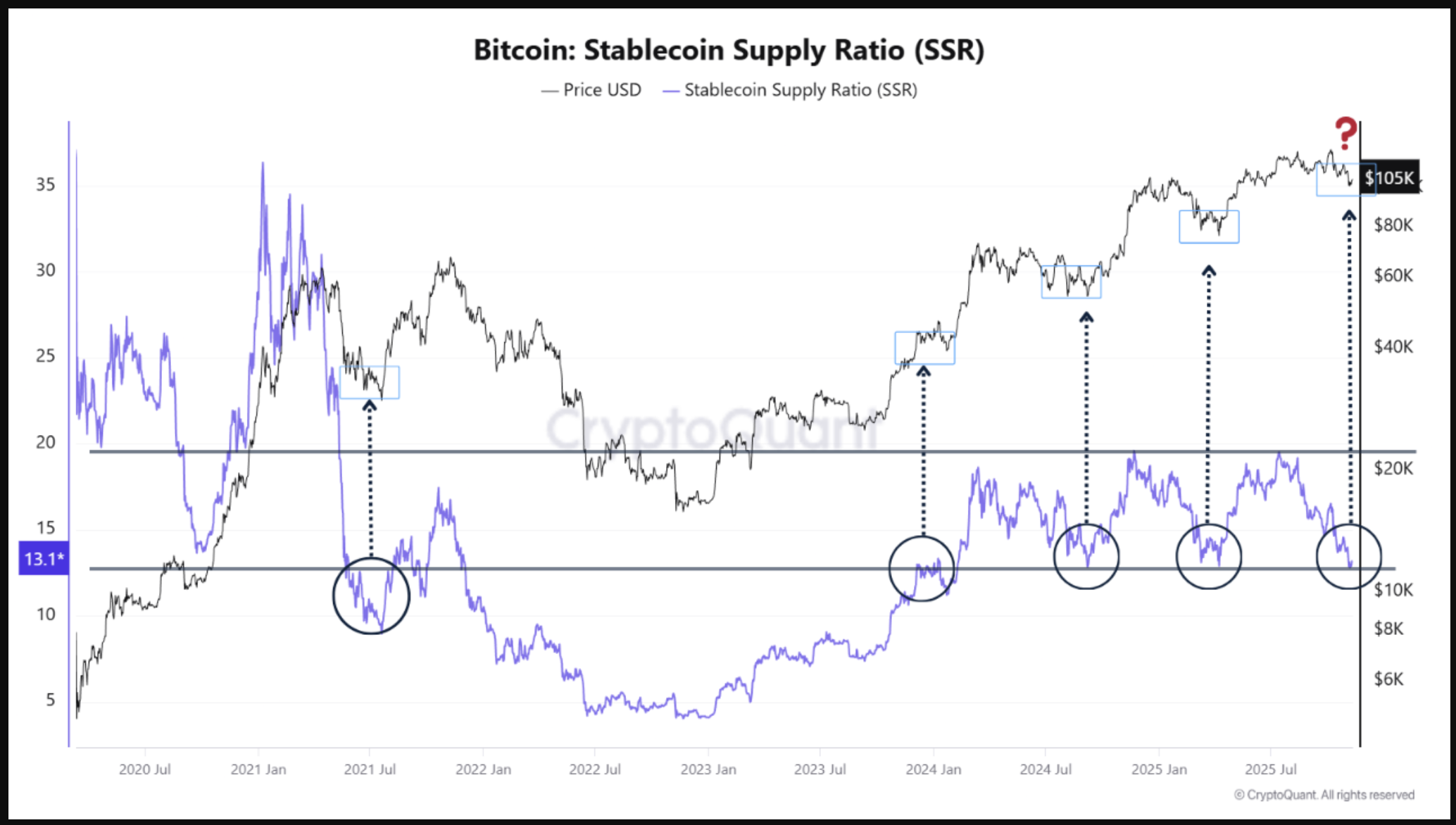 According to CryptoQuant data, the SSR has returned to around 13, a range that previously coincided with Bitcoin’s rebound phases in mid-2021, late-2022, and 2024. Each time, a flood of stablecoin liquidity preceded multimonth BTC rallies.