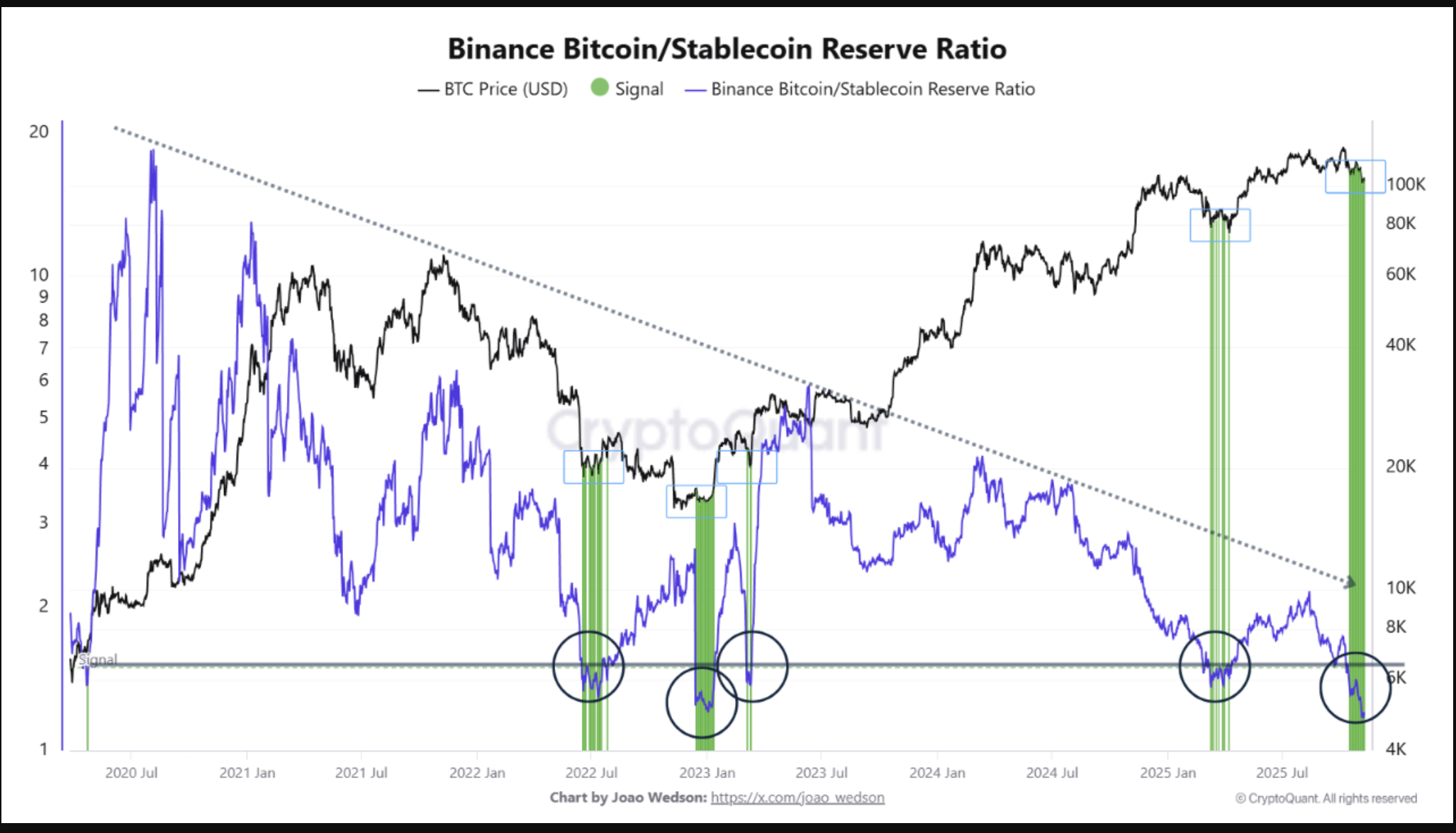 On Binance, Bitcoin reserves have been shrinking while stablecoin balances keep climbing.