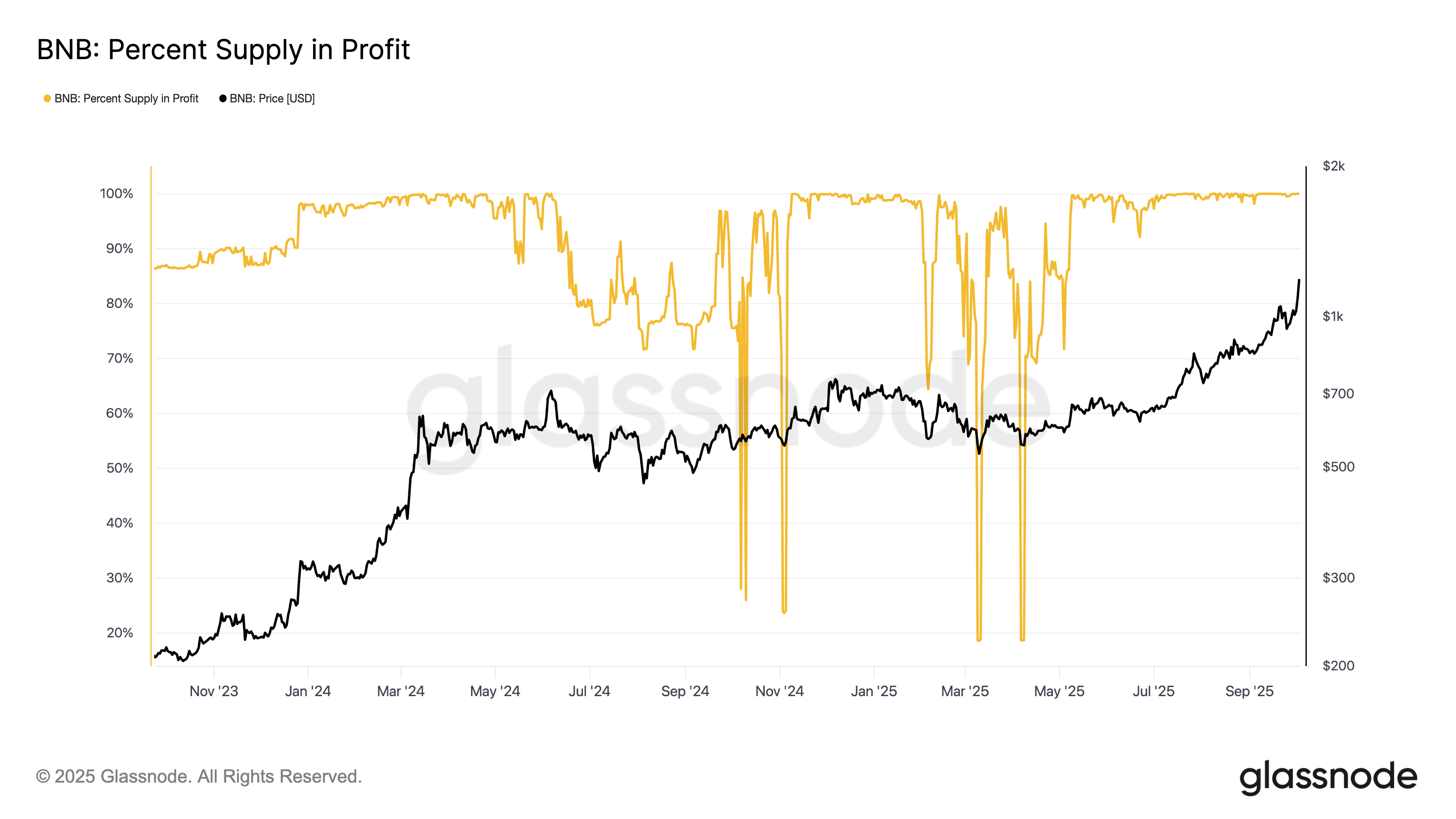 For instance, when supply in profit approached near-perfect levels in March and July 2024, BNB underwent multi-week corrections of more than 15%. A comparable scenario may now be unfolding as the token trades above $1,150.