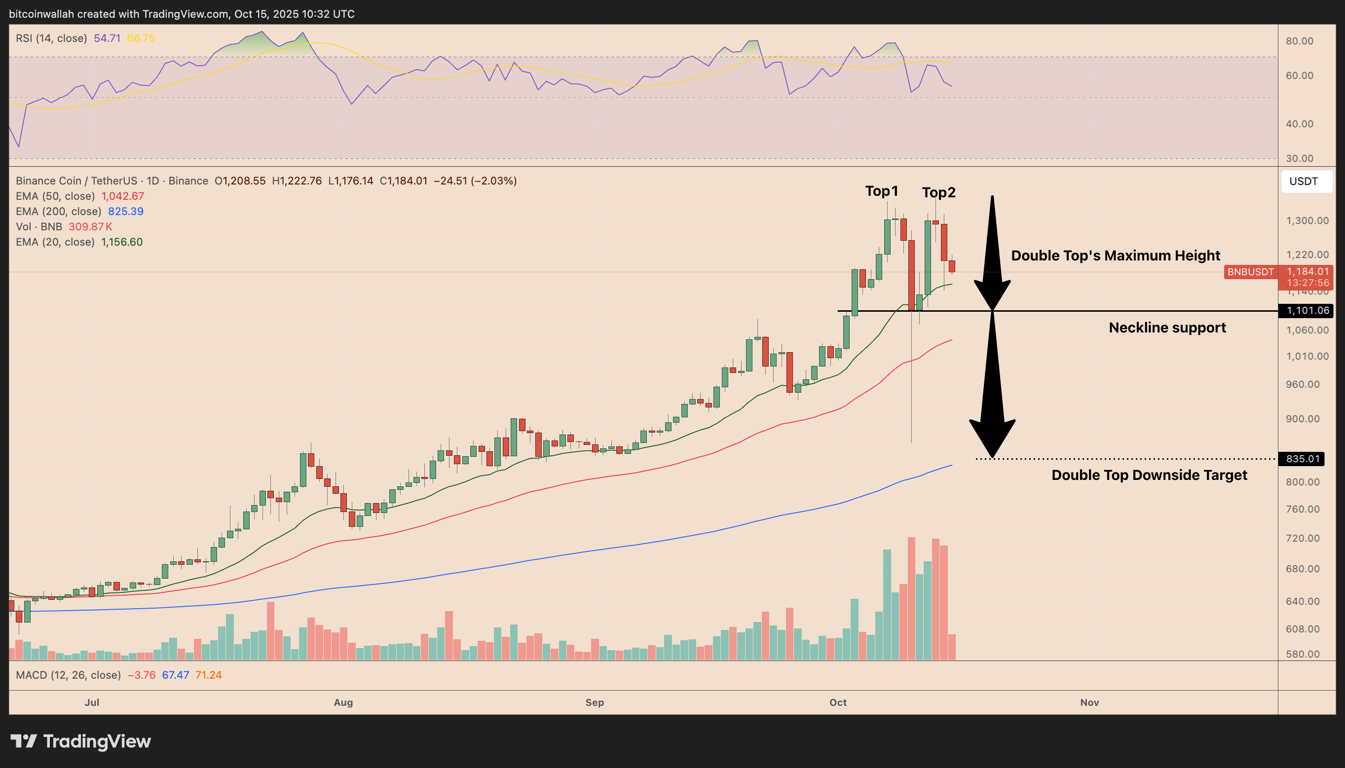 BNB’s daily chart shows a double top pattern, a bearish reversal setup forming near $1,300.