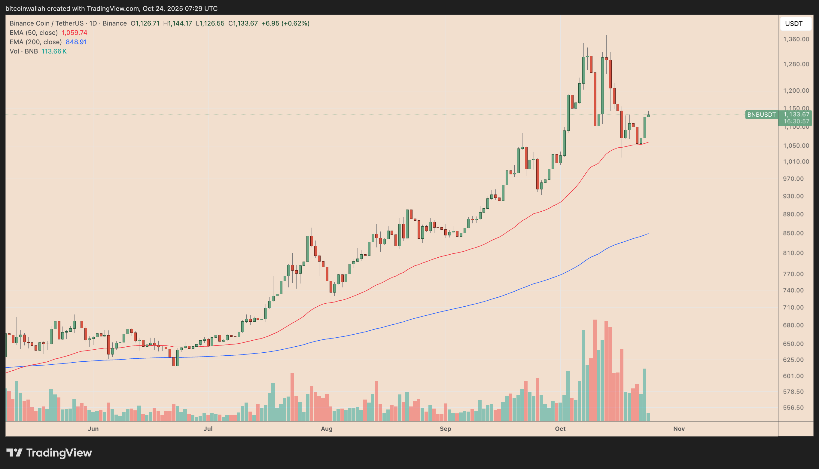 The pattern’s upside target sits around $1,320, derived from adding the wedge’s maximum height to the breakout level near $1,100. This target coincides with the October swing high, suggesting BNB could retest this zone if momentum sustains.