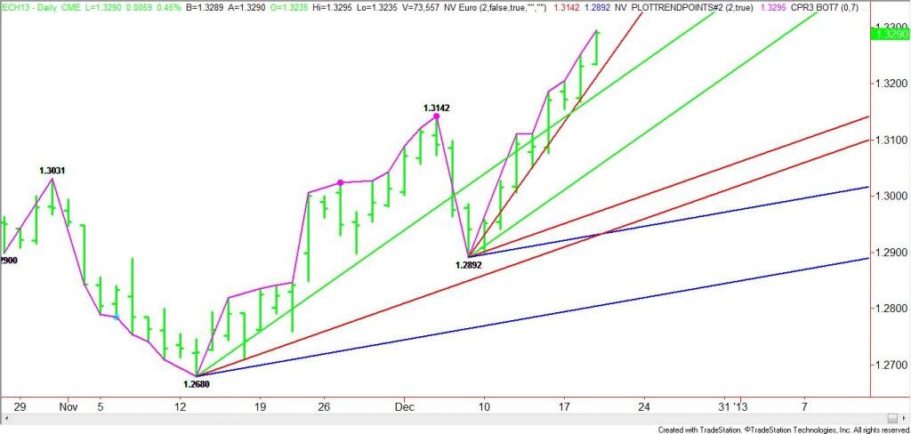 Technically, the March Euro has accelerated to the upside since crossing the December 5 top at 1.3142. The market is currently trading on the bullish side of a Gann angle from the 1.2680 bottom at 1.3180. It is also following a steep uptrending Gann angle at 1.3212. A break through this angle will be the first sign of weakness.
