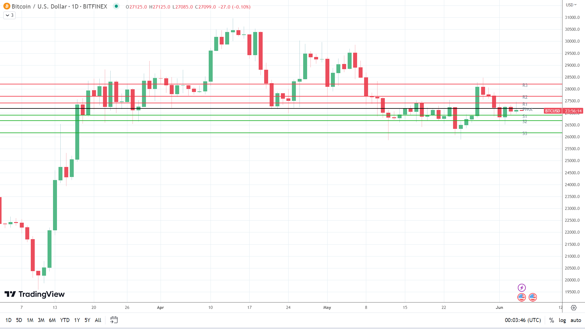 In the event of an extended rally, BTC would likely test the Second Major Resistance Level (R2) at $27,696 and resistance at $28,000. The Third Major Resistance Level (R3) sits at $28,205.
