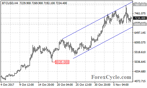 On the downside, a clear break below the bottom of the channel will suggest that the uptrend from 5020 had completed at 7887 already and lengthier consolidation for the longer term uptrend from 2970 is underway. Then the Bitcoin price would find support at the bullish trend line on the daily chart now at around 6300.