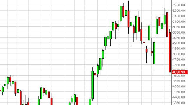 The CAC fell hard during the course of the week as most European indices did. With this, we believe that the market is going to try to find support below, but we certainly can’t buy quite yet as there is more than enough bearish pressure at this point. However, we find some type of supportive candle close to the 4600 level, or even better yet at the 4500 level, we would be buyers. With this, we believe that the market should continue to offer buying opportunities as part of the overreaction would be due to lack of volume.