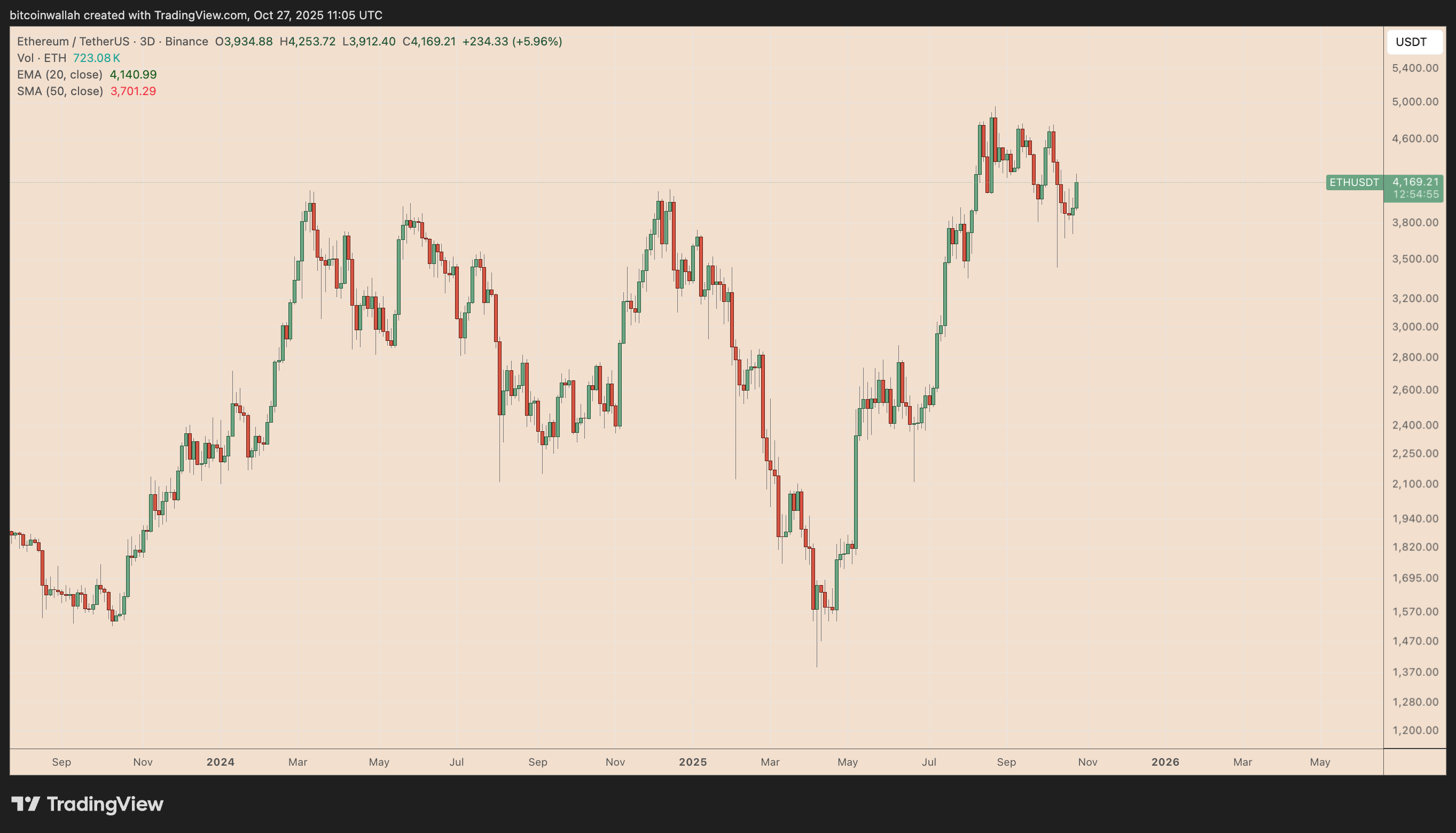 The second-largest cryptocurrency rose 8% to over $4,250 on Monday, extending its recovery momentum from Oct. 10 low of $3,435.