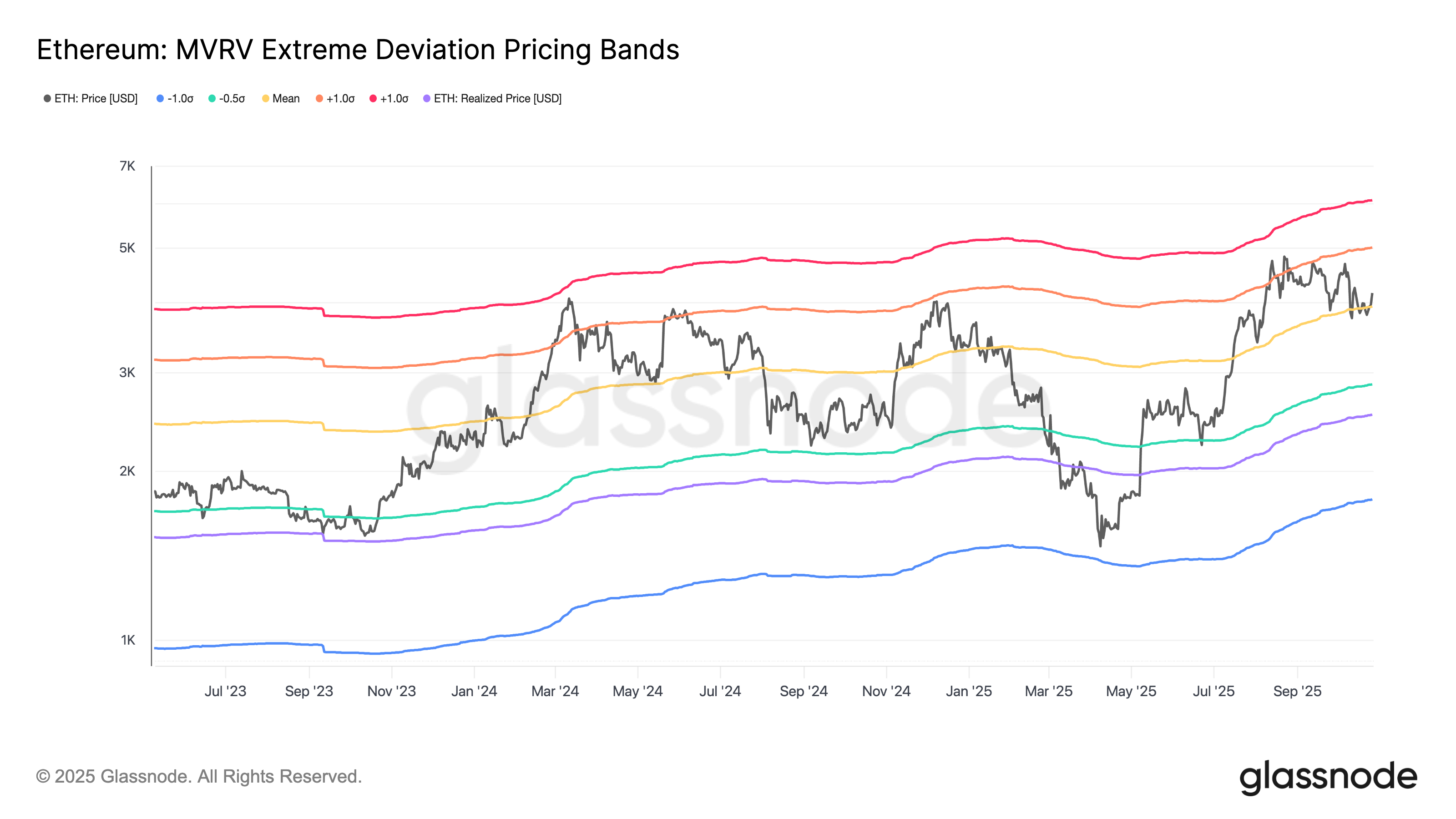 Historically, ETH rallies have accelerated after reclaiming the +1σ line, with the next statistically stretched zone around +2σ aligning with the $5,000–$5,200 range.