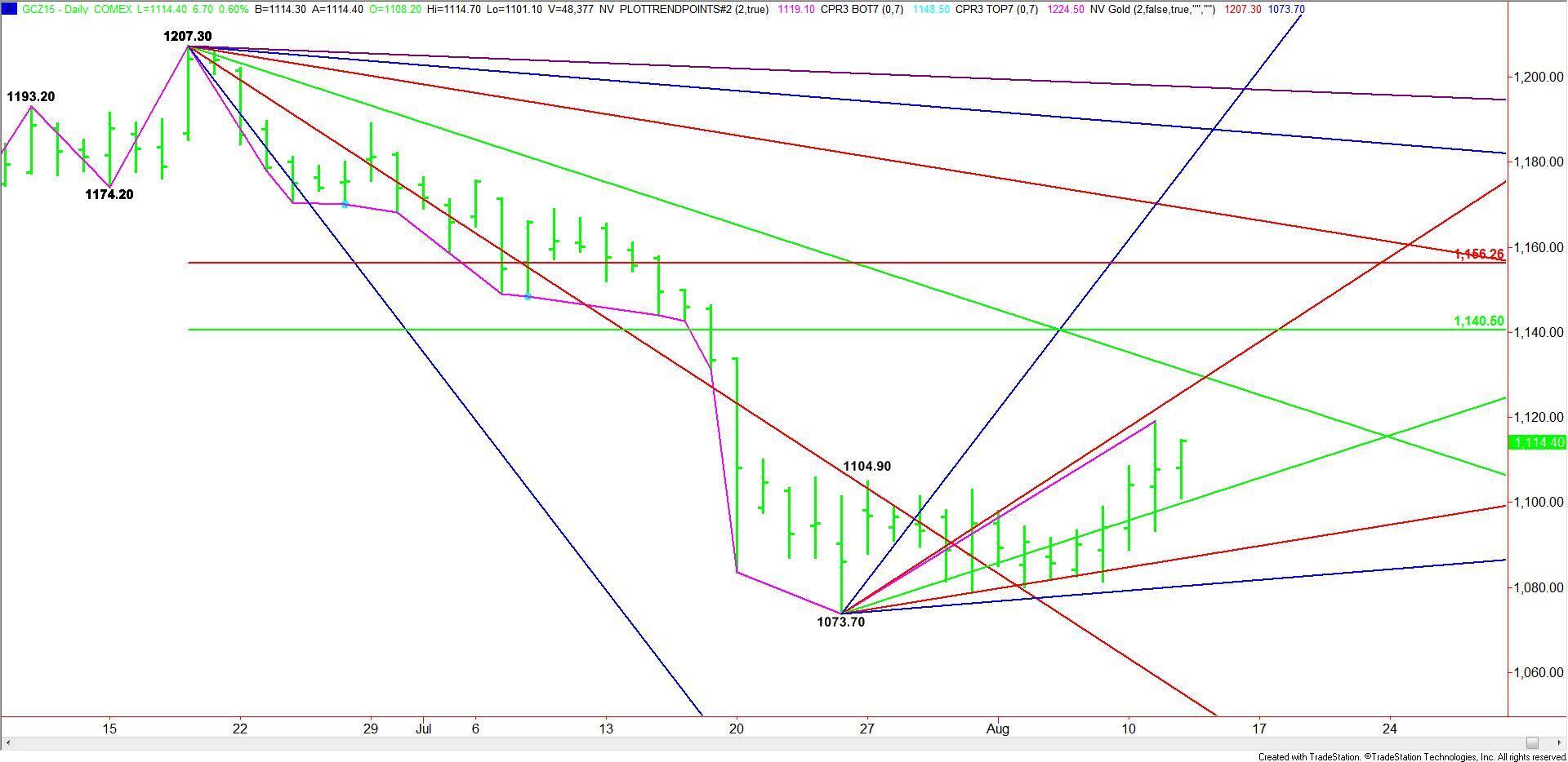 The main trend is still down according to the daily swing chart, however, momentum has shifted to the upside. The main range is $1207.30 to $1073.70. Its retracement zone at $1140.50 to $1156.30 remains the primary upside target. Since the main trend is down, aggressive sellers may be waiting inside the retracement zone to initiate fresh short positions.