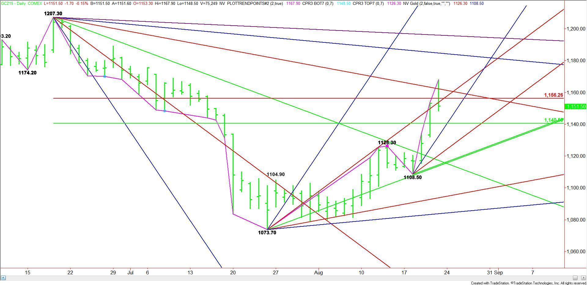 The main range is $1207.30 to $1073.70. Its retracement zone is $1140.50 to $1156.30. Earlier in the session, the market took out the upper or Fibonacci level at $1156.30 before breaking back below it. This price is new resistance while the lower or 50% level is new support.