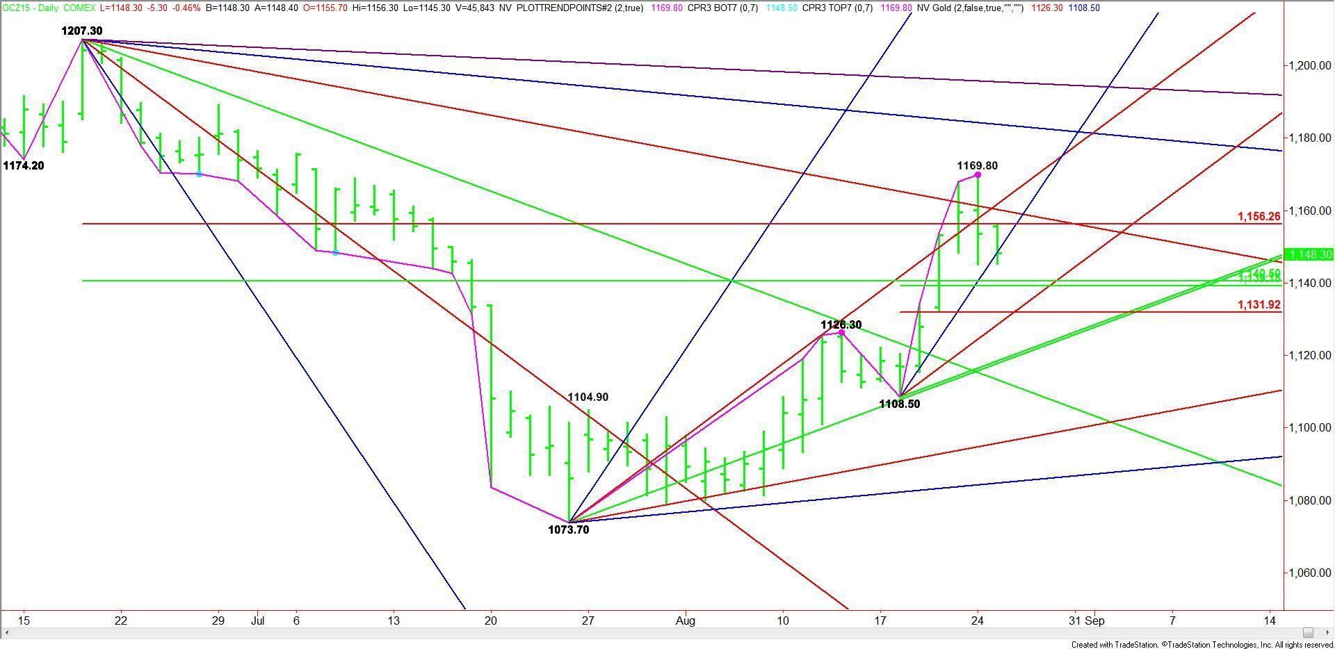 December Comex Gold futures posted a potentially bearish closing price reversal top on Monday. The chart pattern will be confirmed on a break through $1145.10. Based on the short-term range of $1108.50 to $1169.80, the primary downside objective today is its retracement zone at $1139.10 to $1131.90.