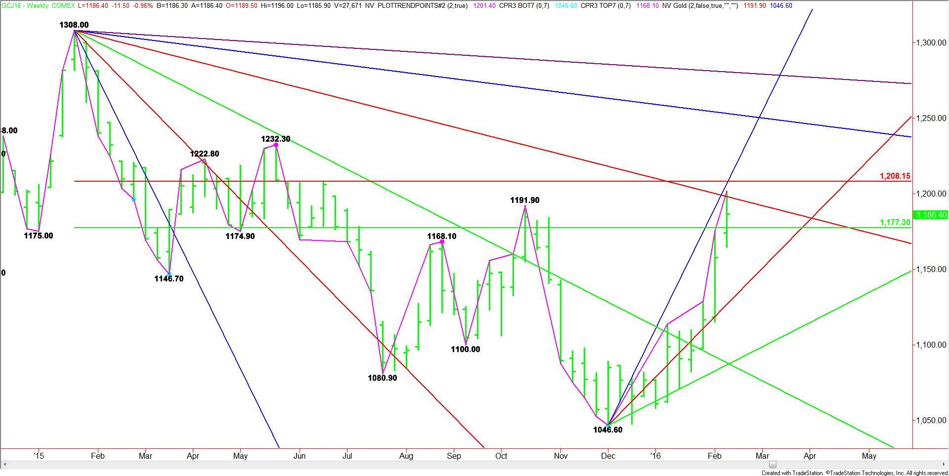 Based on the current price at $1194.00 the direction of the market the rest of the week is likely to be determined by trader reaction to the downtrending angle at $1198.00.