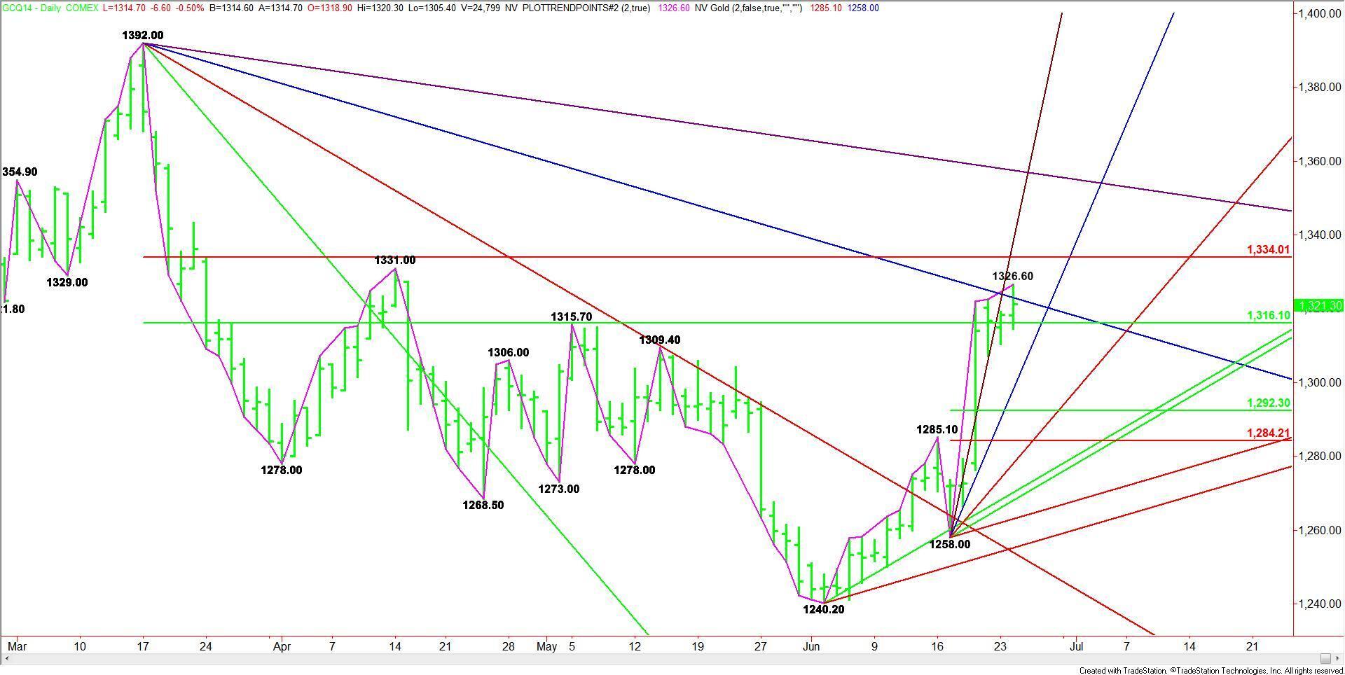 August Comex Gold futures poked higher to $1326.60 on Tuesday, but the market remained inside the major retracement zone which should determine the