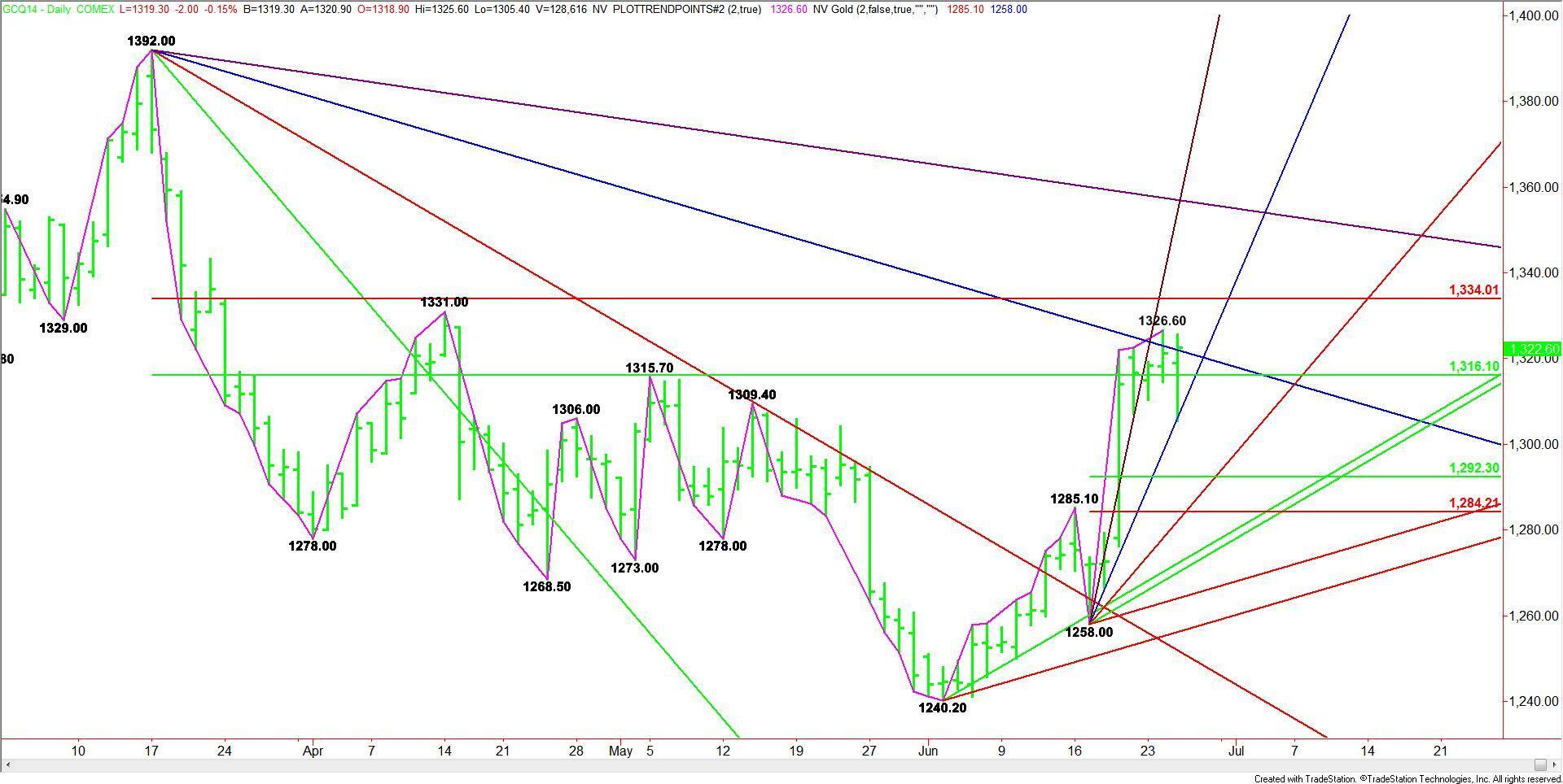 The angle appears to be controlling the short-term direction of the market. A sustained move over it today could trigger a rally into $1334.00. A failure to overcome this angle could lead to a break into the nearest uptrending support angle at $1314.00.