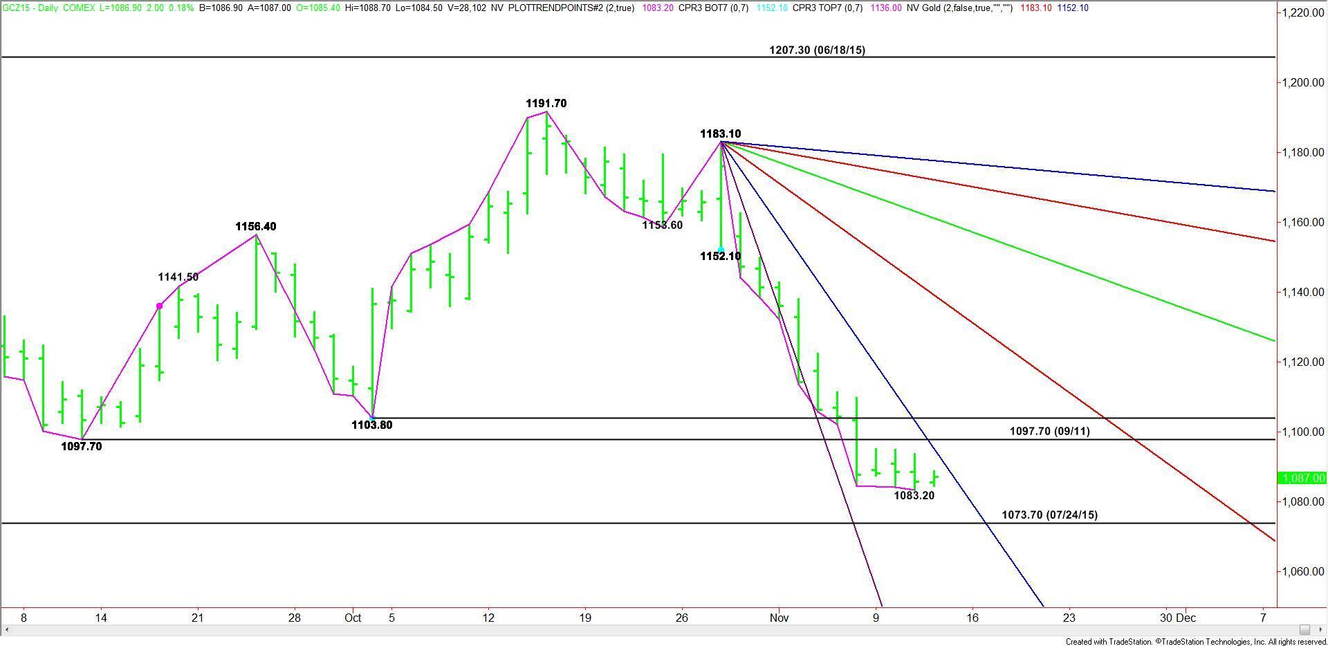 Technically, the main trend is down according to the daily swing chart, however, the price action suggests gold has been treading water most of the week. Gold has inched lower most of the week, but each move has been met with a short-covering rally. Last week’s low was $1084.50. This week’s low is $1083.20. This suggests that the selling pressure this week has been tentative as if short-sellers were shying away from selling weakness.