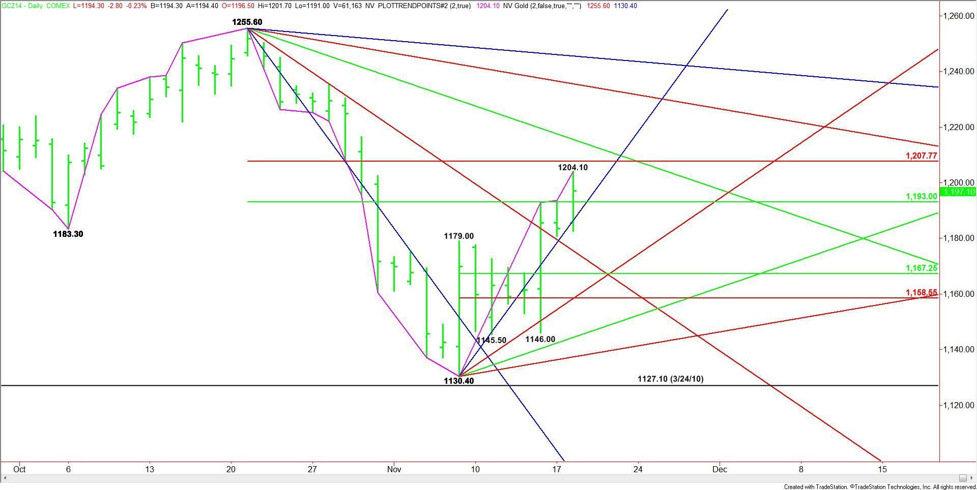 A breakout over $1207.80 could lead to a quick move into the next downtrending angle at $1213.60. The daily chart opens up over this angle with another angle at $1234.60 the next potential upside target.