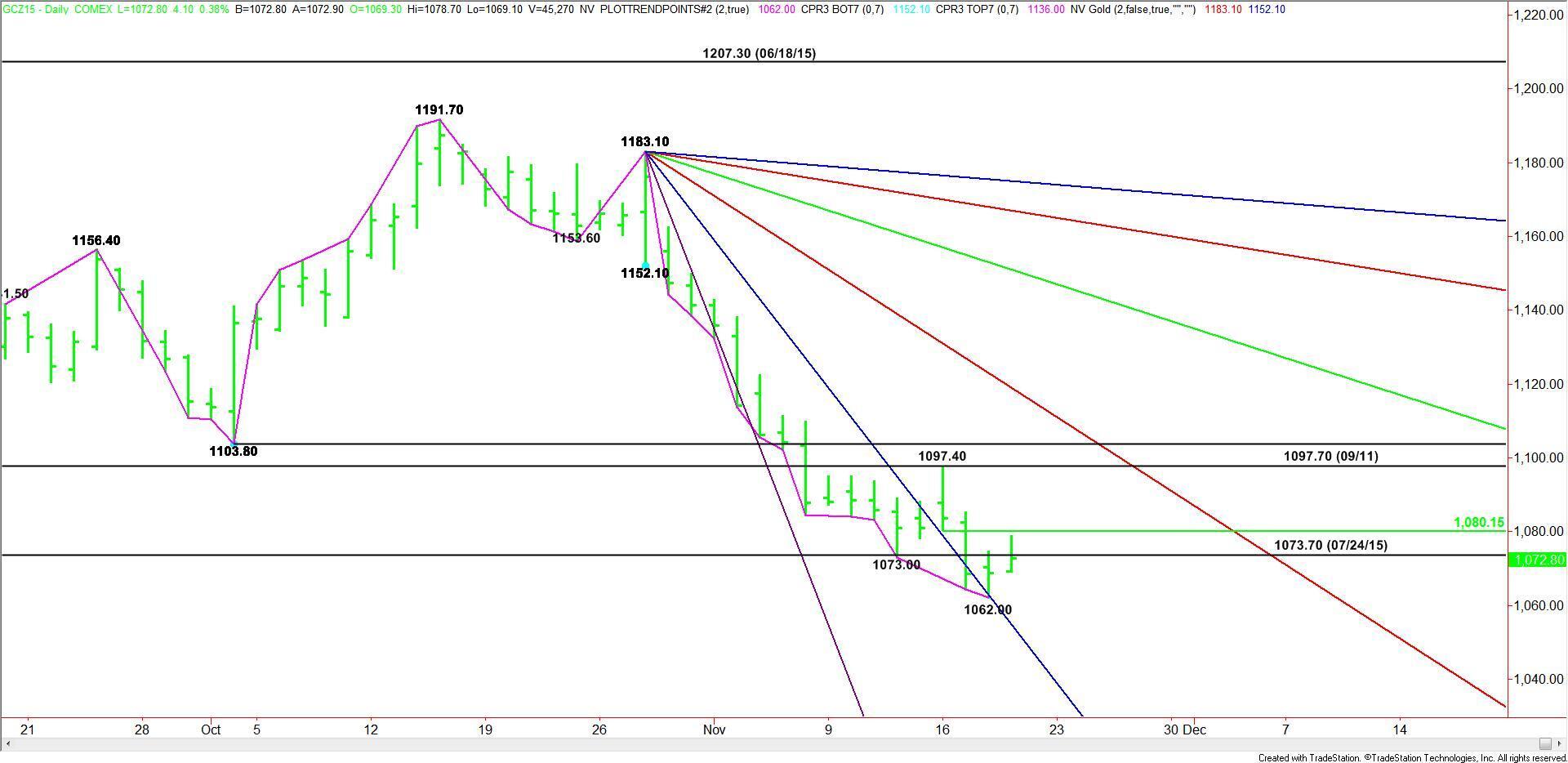 December Comex Gold futures have a slight upside bias shortly before the New York opening. The market is rebounding after reaching a multi-year low at $1062.00 on Wednesday. It is currently straddling the former bottom at $1073.70 from July. This indicates that yesterday’s break may have been an exhaustive move.