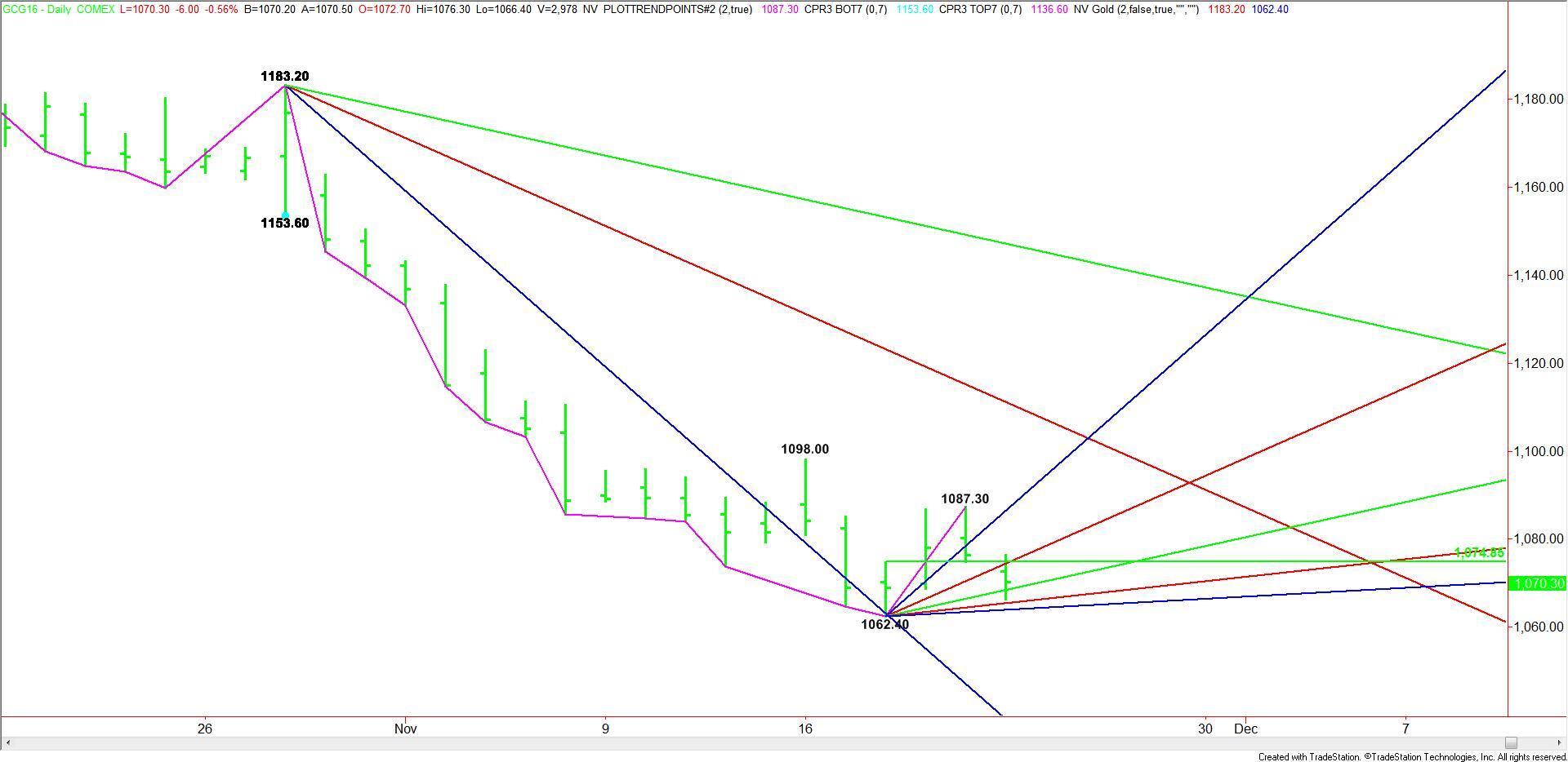 The main trend is down according to the daily swing chart. The current main bottom is $1062.40. A trade through this level will signal a resumption of the downtrend. The new minor top is $1087.30. A trade though this level will indicate the counter-trend buying is getting stronger.