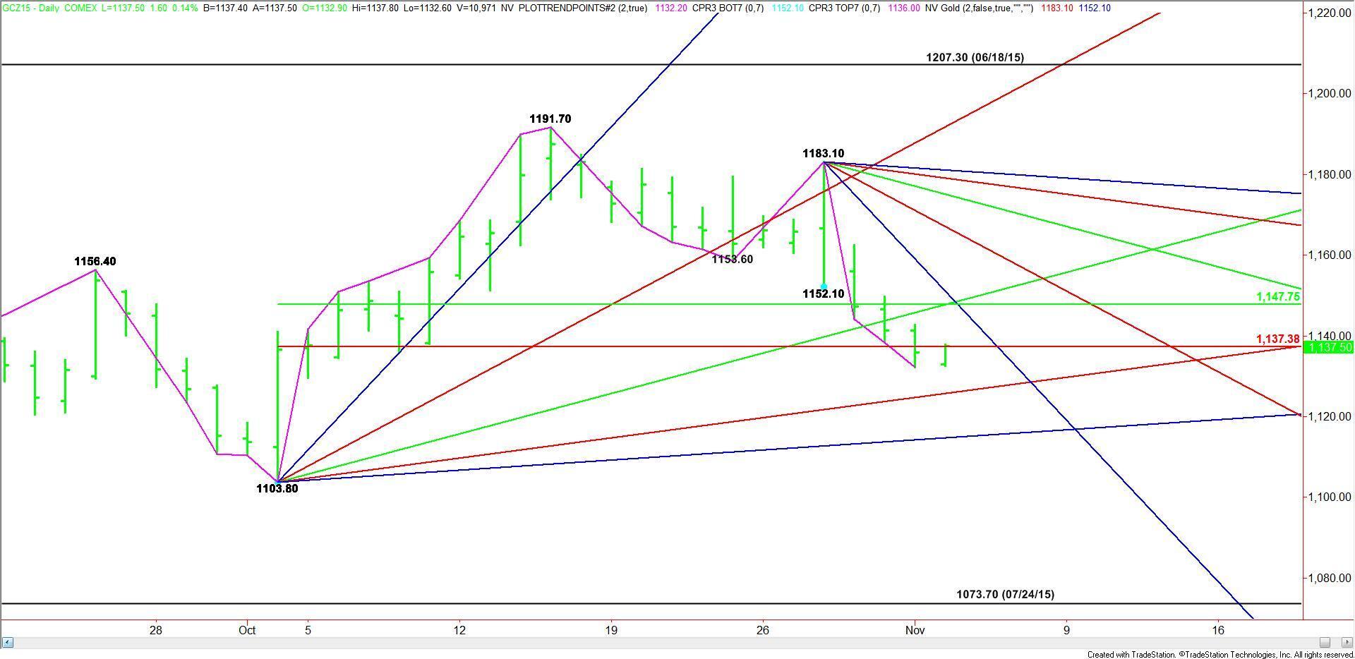 December Comex Gold futures finished lower on Monday as investors continued to adjust to the possibility of a Fed rate hike in December. With the market trading near a key retracement zone, it still looks like traders are a little indecisive about how to play the market ahead of the U.S. Non-Farm Payrolls report on Friday. This could lead to a sideways, two-side trade over the next several days.